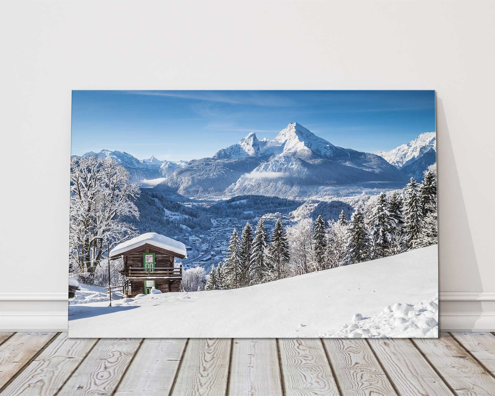 Idyllic winter landscape in the Alps with a mountain lodge. Picture printed and framed as a canvas print. Choice of... Read more