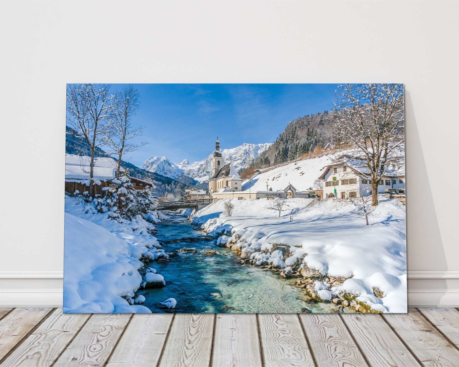 Scenic winter landscape in the Alps, with famous church of St. Sebastian in Ramsau. Picture printed and framed as a... Read more