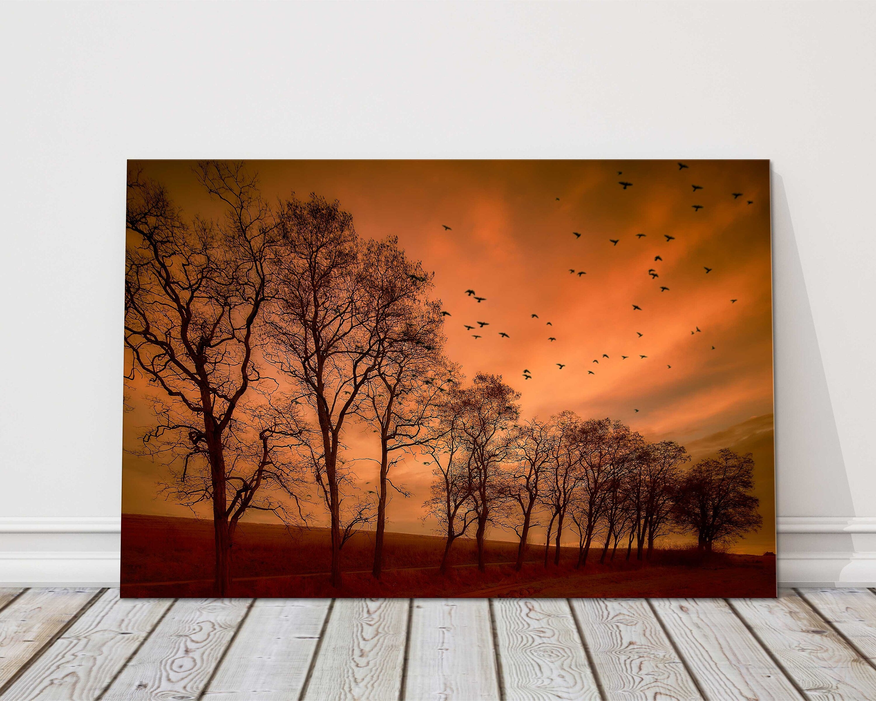 DESCRIPTION Birds flying over an Autumn evening landscape. Picture printed and framed as a canvas print. Beautiful orange evening sunset.... Read more