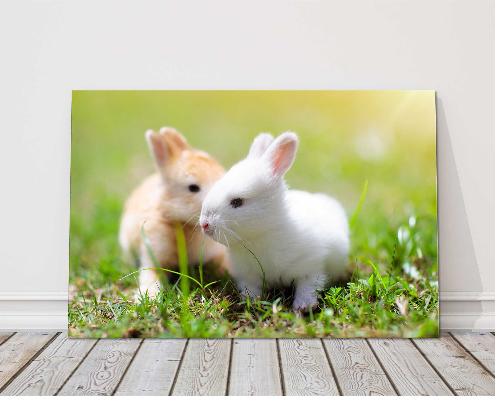 Baby rabbits in the garden. Cute animals. Printed as a canvas picture.