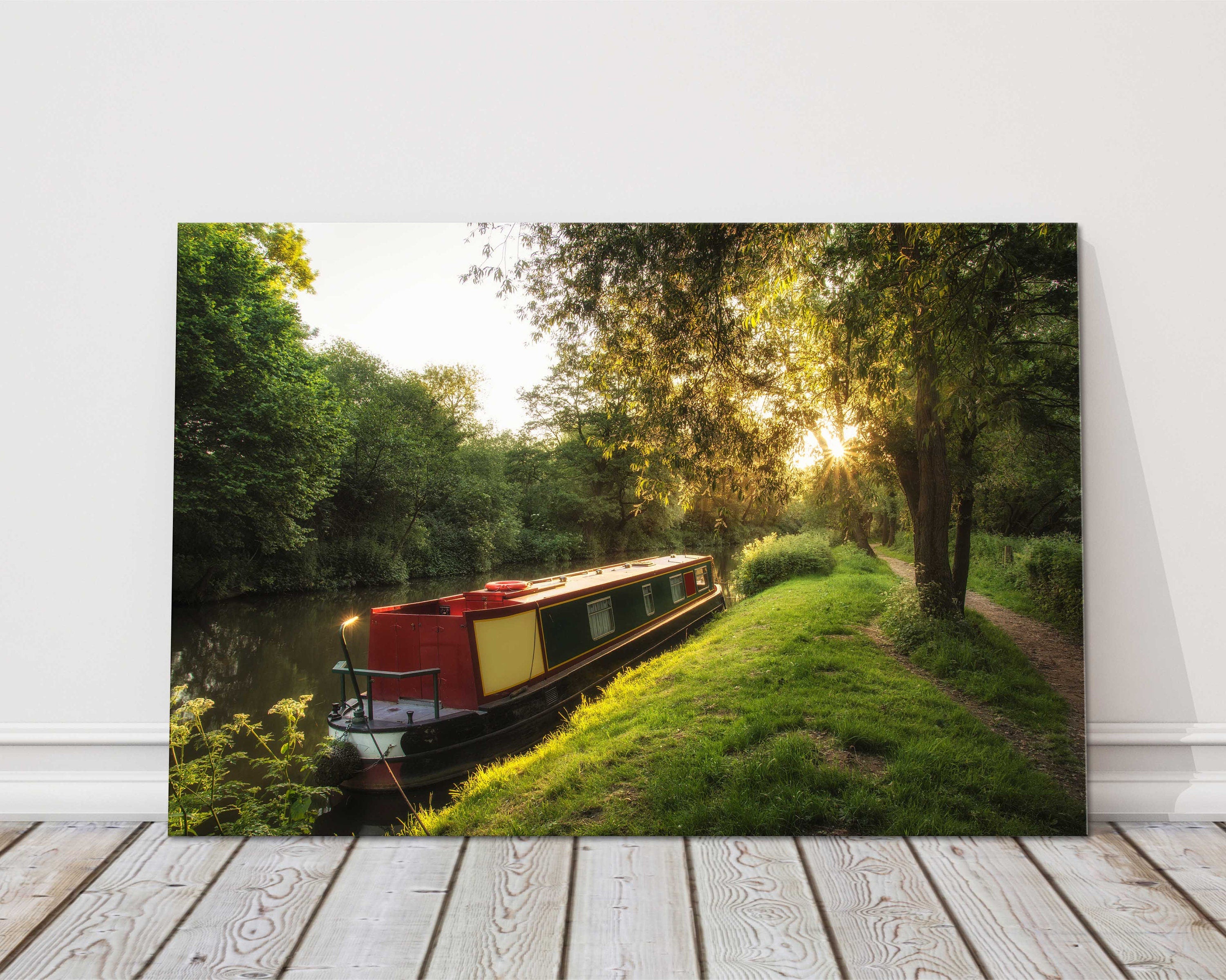 DESCRIPTION Barge boat on the canal at sunrise. Picture printed and framed as a canvas print. Beautiful landscape image. Available... Read more
