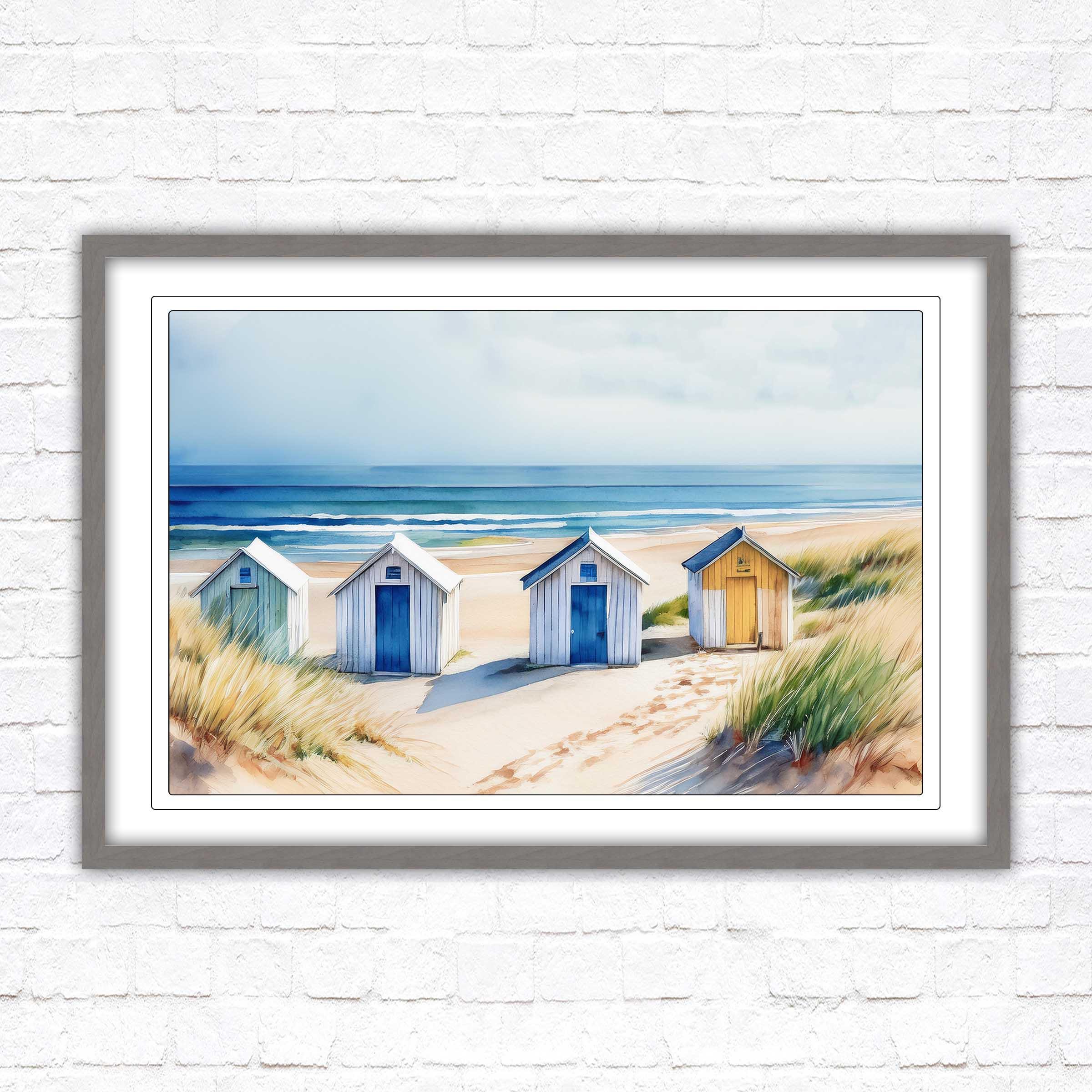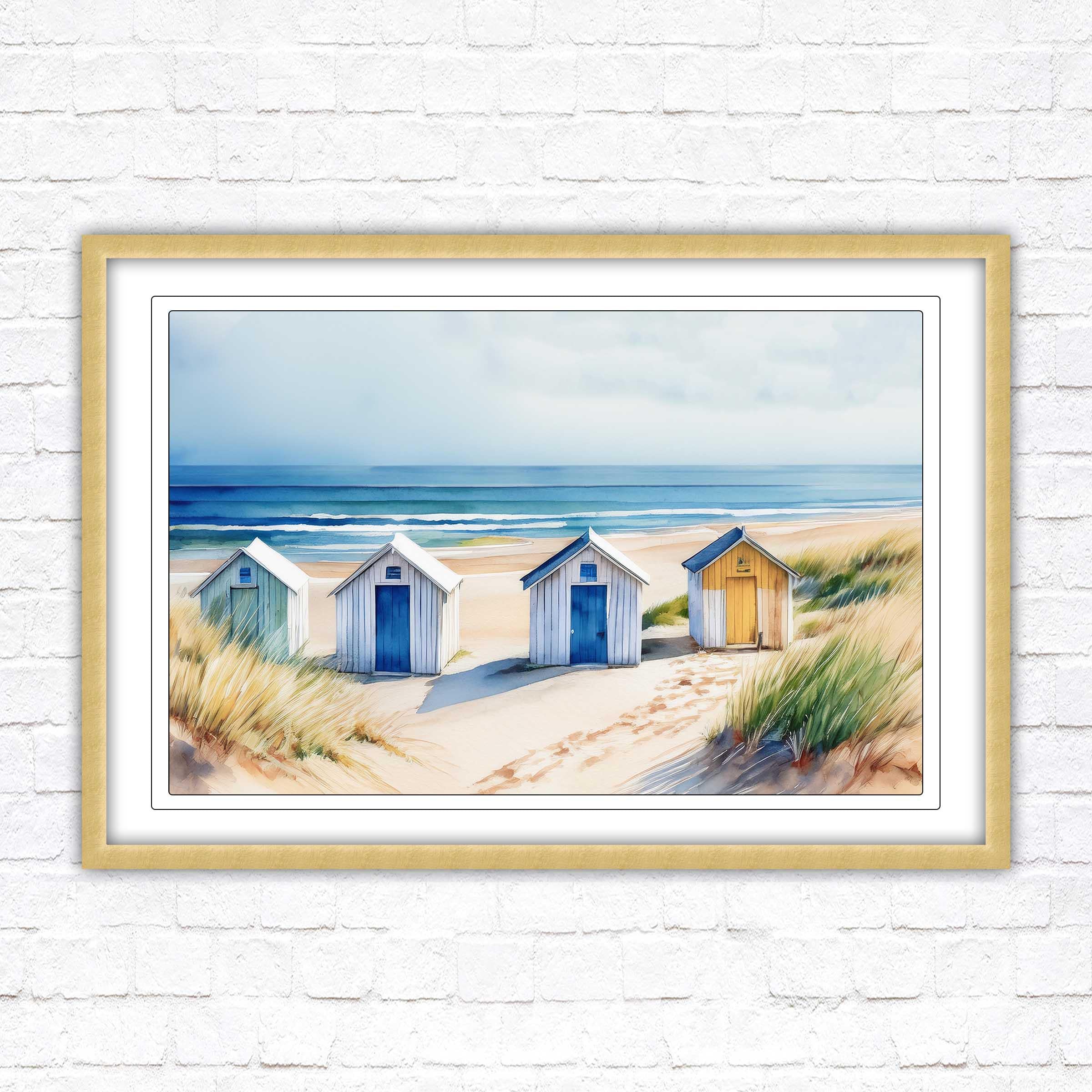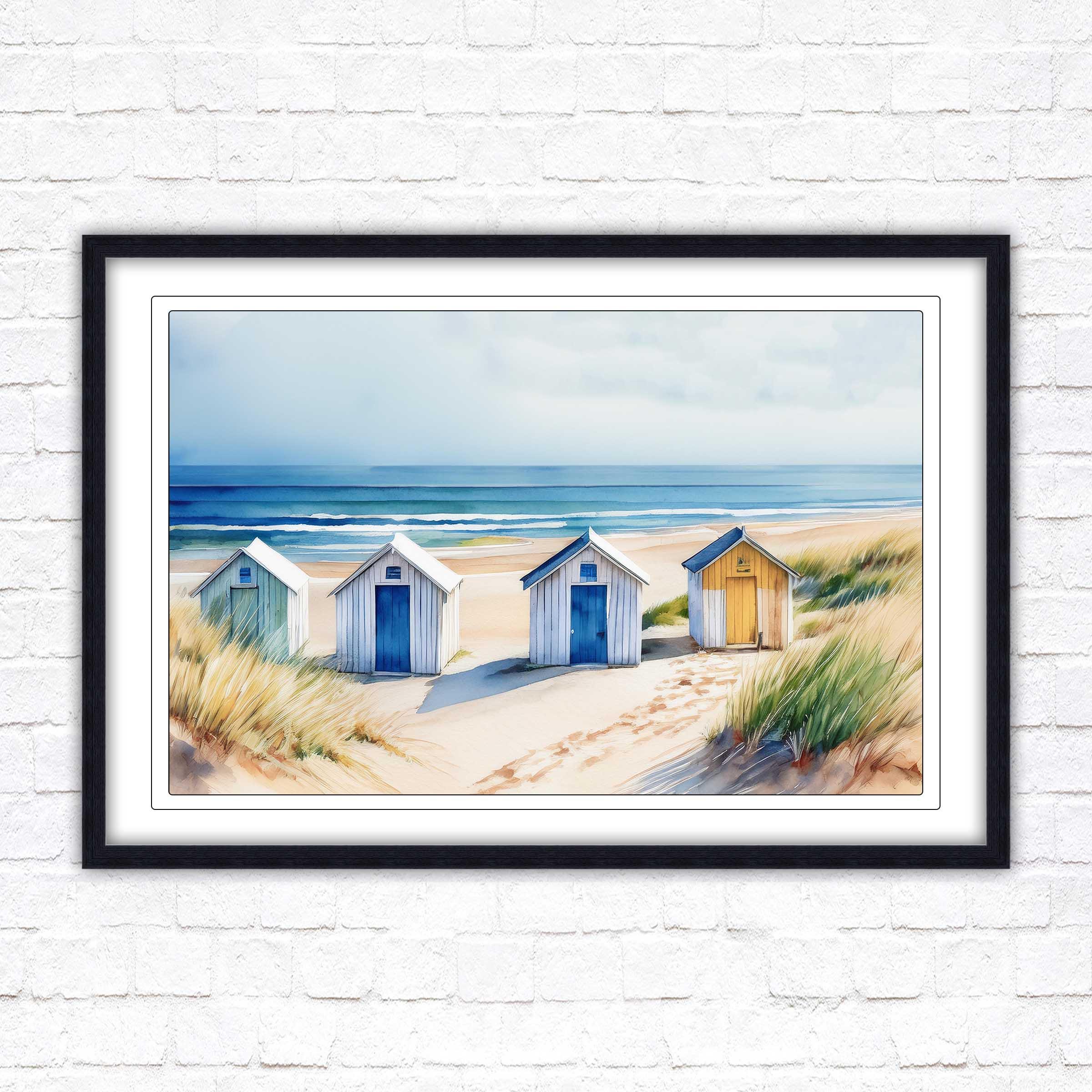 Beach Huts: A beautifully detailed watercolour that showcases beach huts standing proudly against a crisp blue sky.