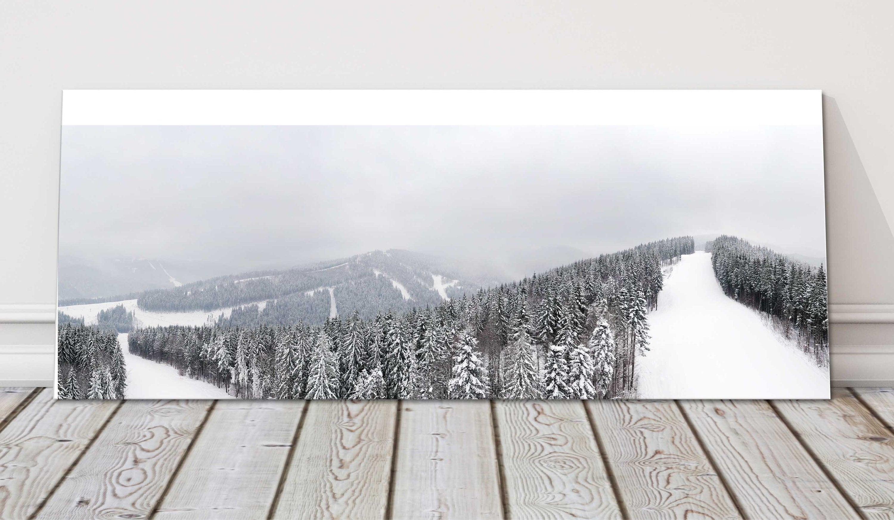 A beautiful panoramic picture of a winter forest. Pictured in black and white. Printed and framed as a canvas picture. Choice of sizes available to order to suit any home.