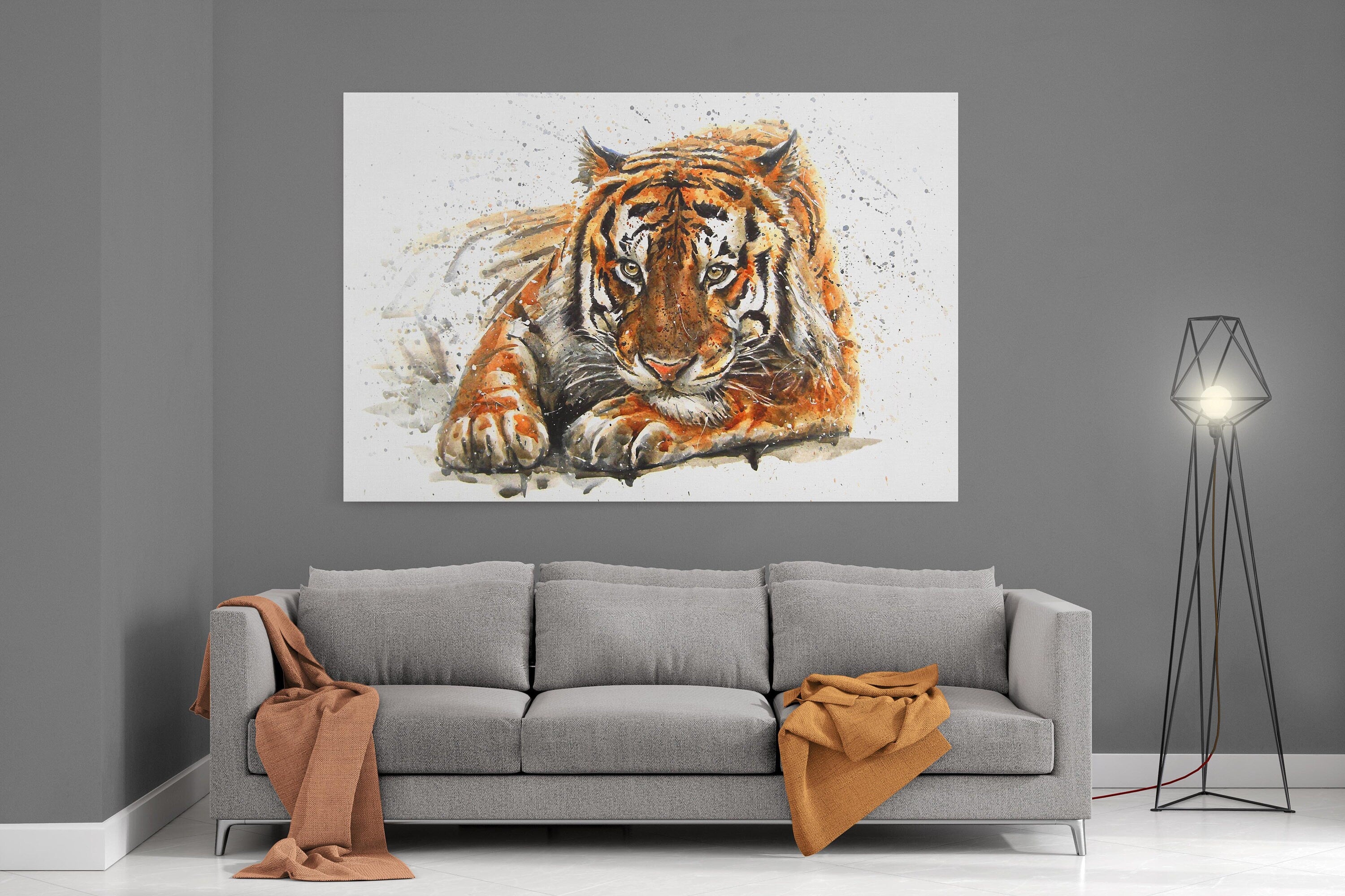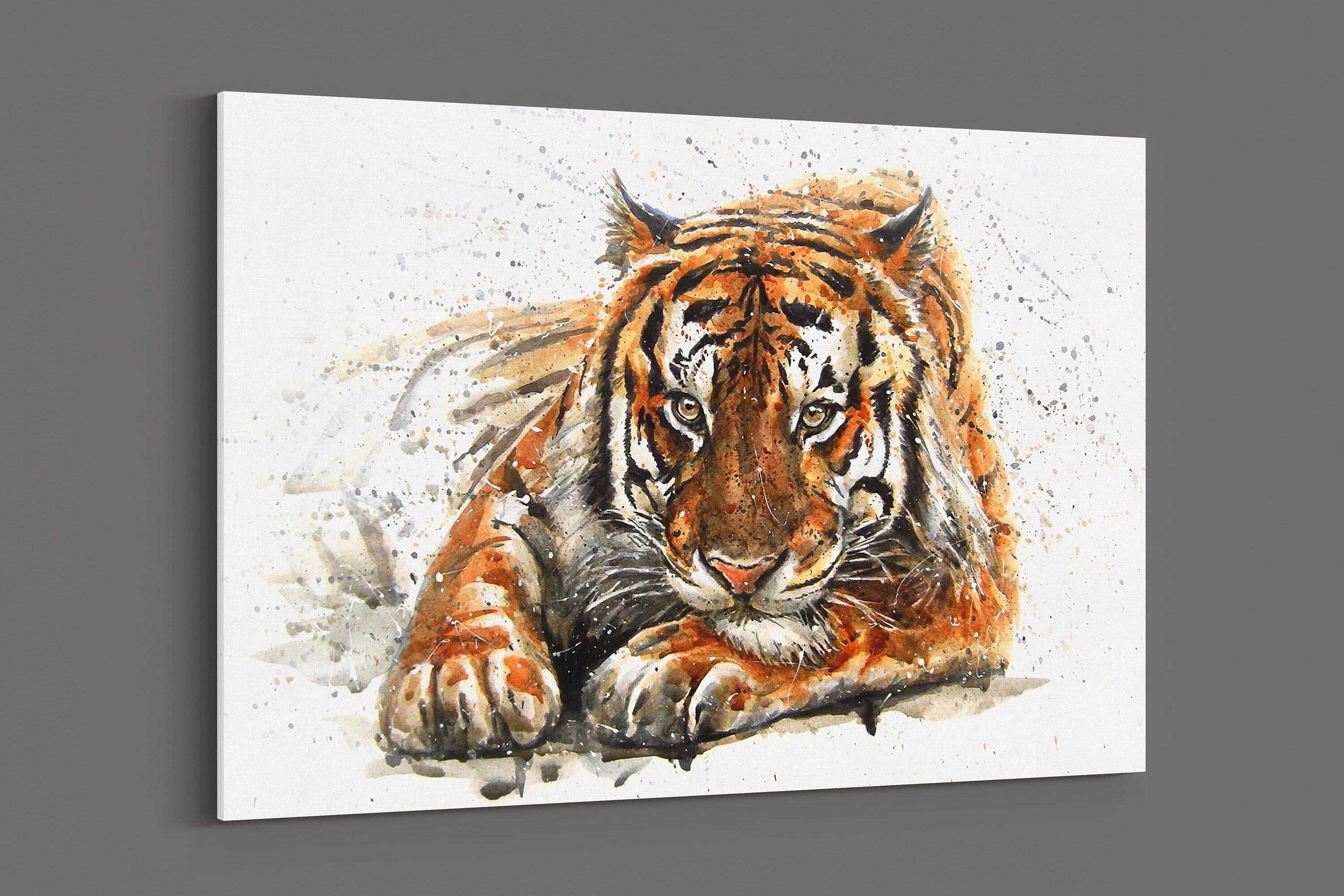 A beautiful landscape picture of a Bengal tiger. Watercolour painting with splash effect. Canvas picture available in all sizes to suit the home or office.