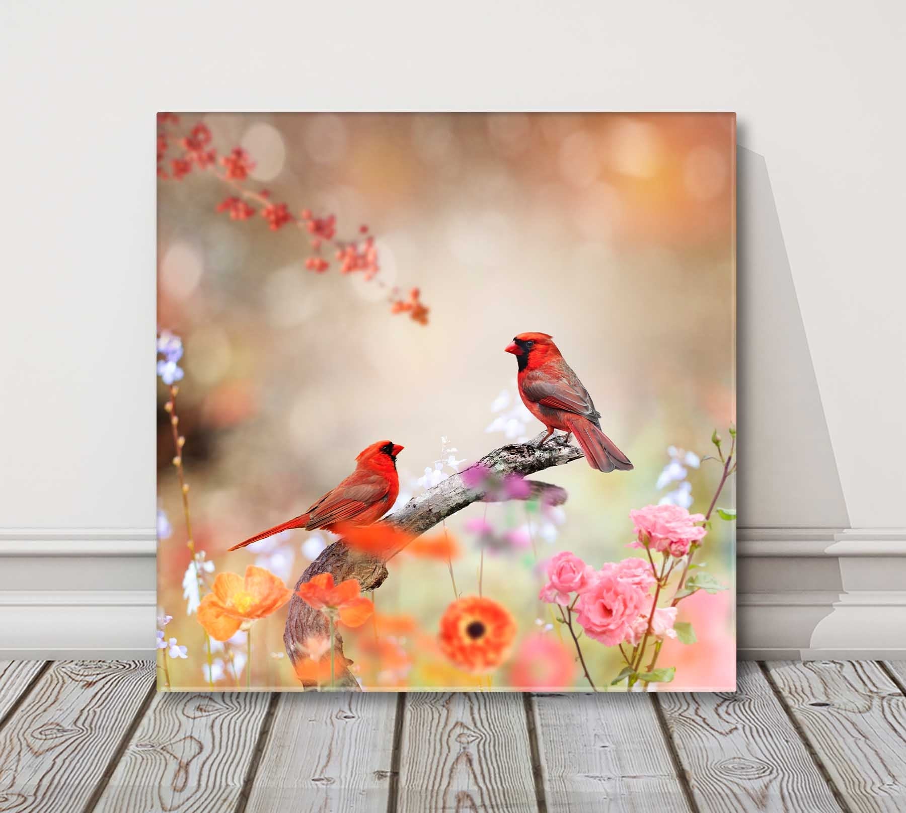 Birds and flowers. Northern Cardinals perched on a branch, surrounded by wild flowers. Colourful birds, Canvas picture print. Available in choice of sizes. Nice bright wall decor for any room.