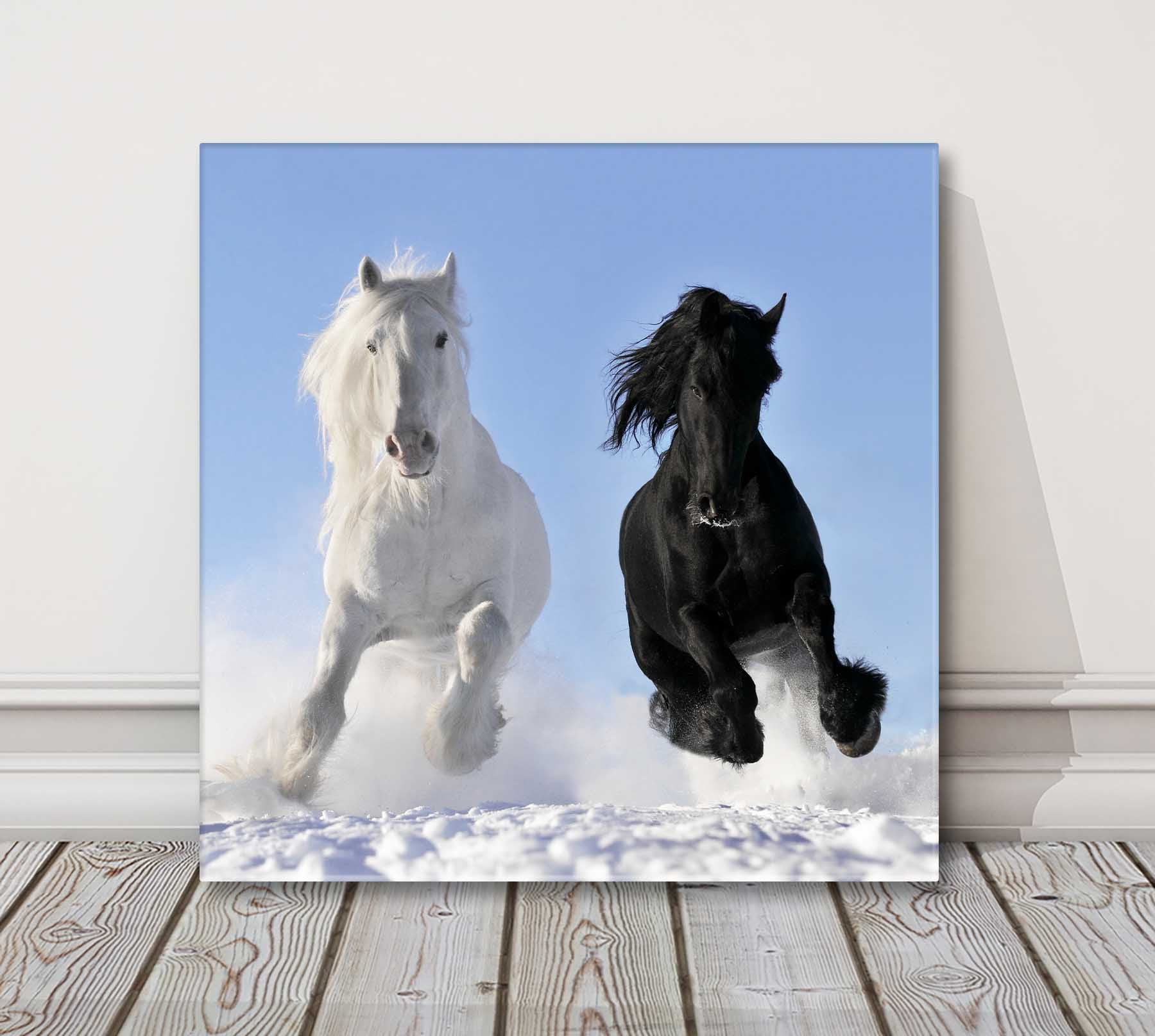White and black horses galloping through the surf, on a blue background. Canvas pictutre print. Choice of sizes available.