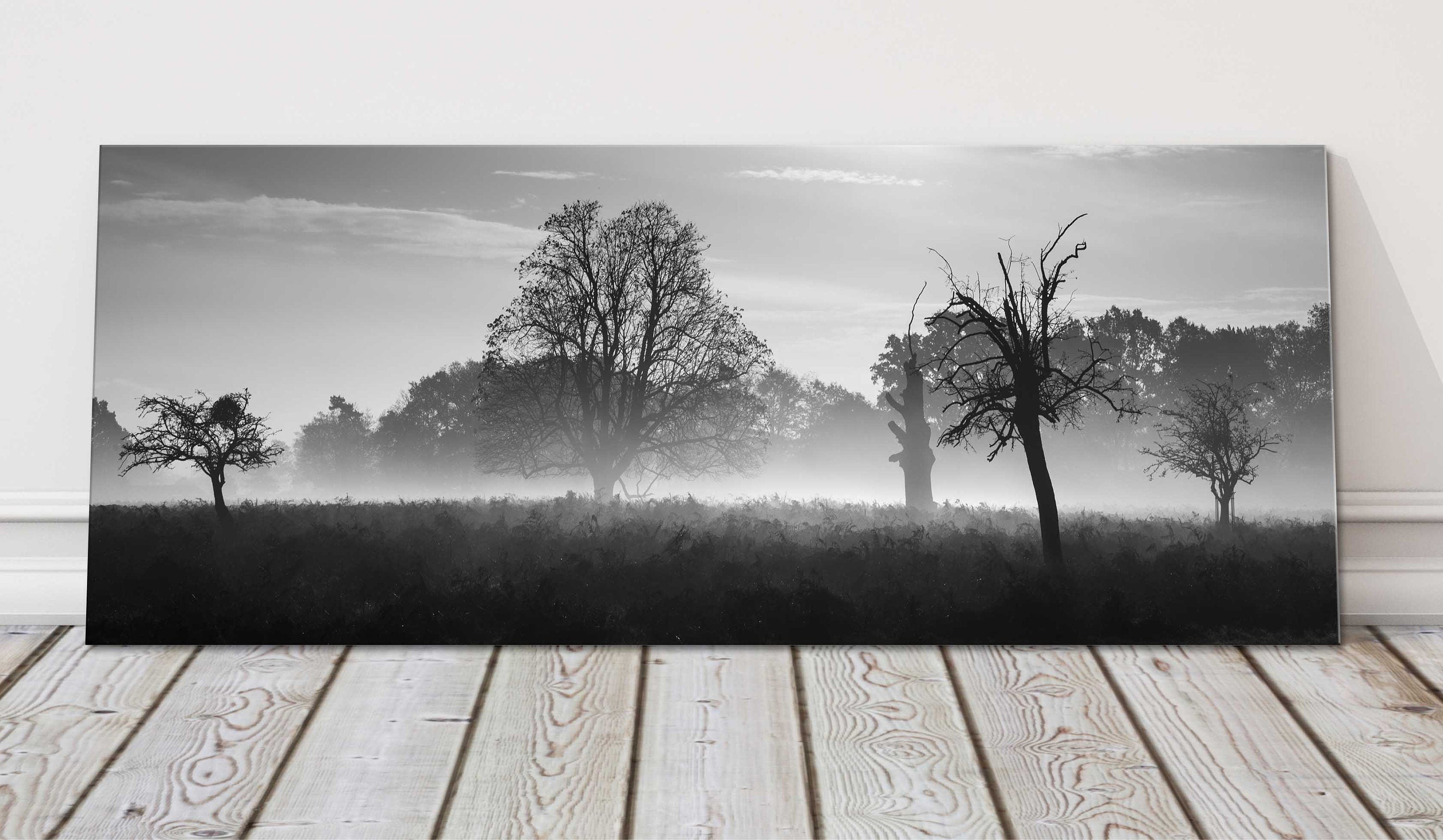 A beautiful panoramic picture of a foggy countryside. Pictured in black and white. Printed and framed as a canvas picture. Choice of sizes available to order to suit any home.