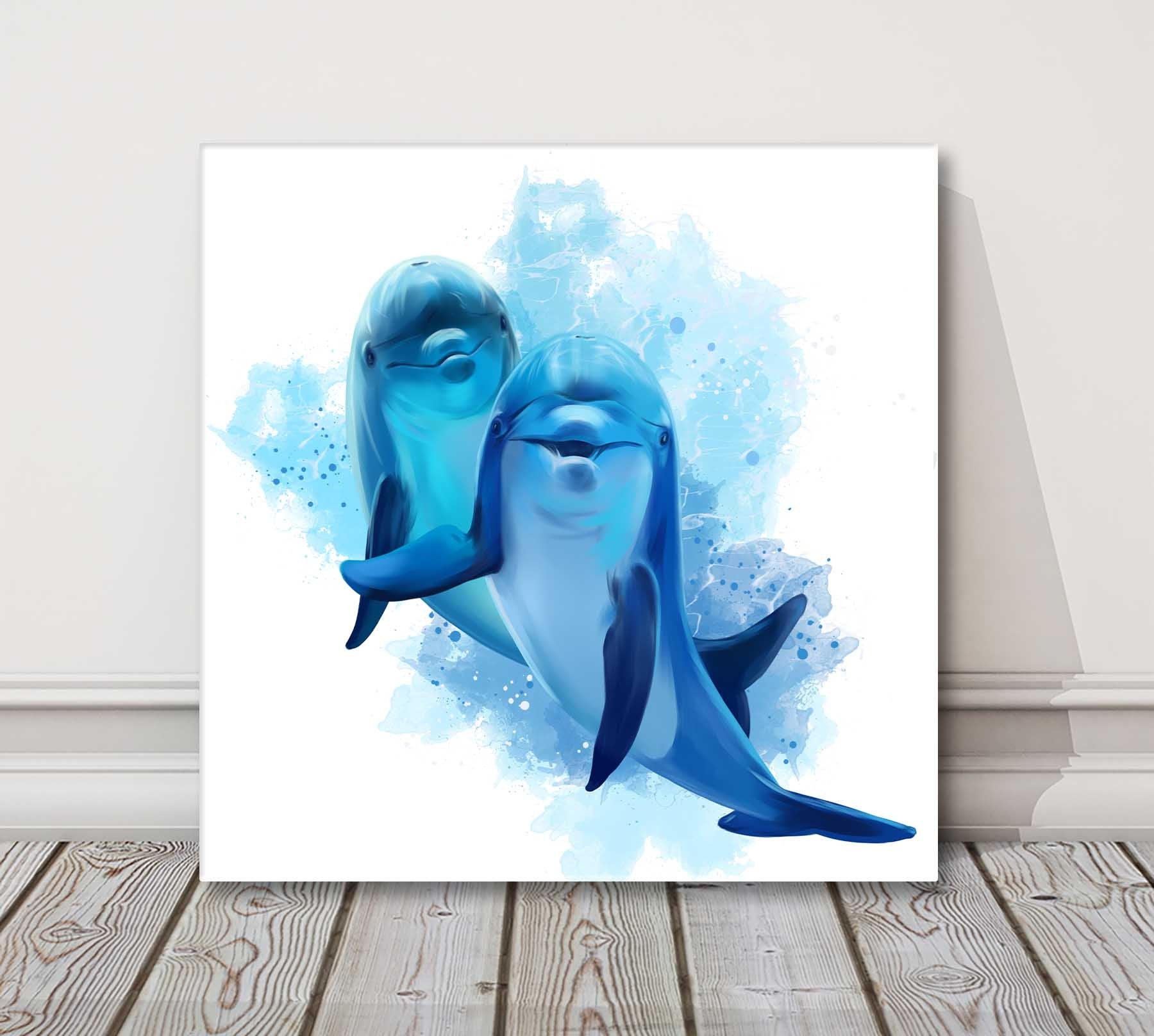 Two blue dolphins, watercolour illustration with a white background canvas picture print