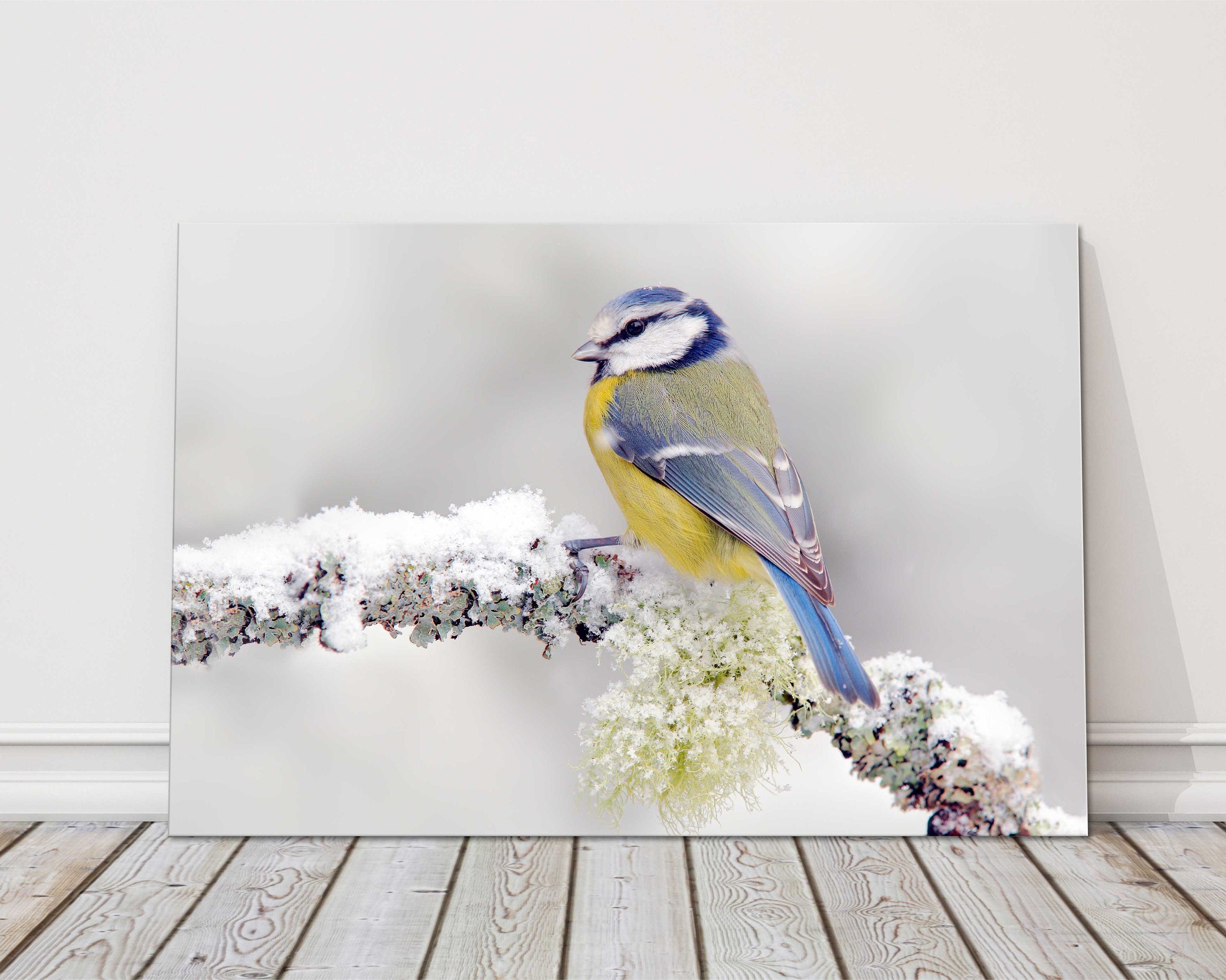Blue Tit on a frosty snow covered branch. Cute songbird in winter. Picture printed and framed as a canvas print.... Read more