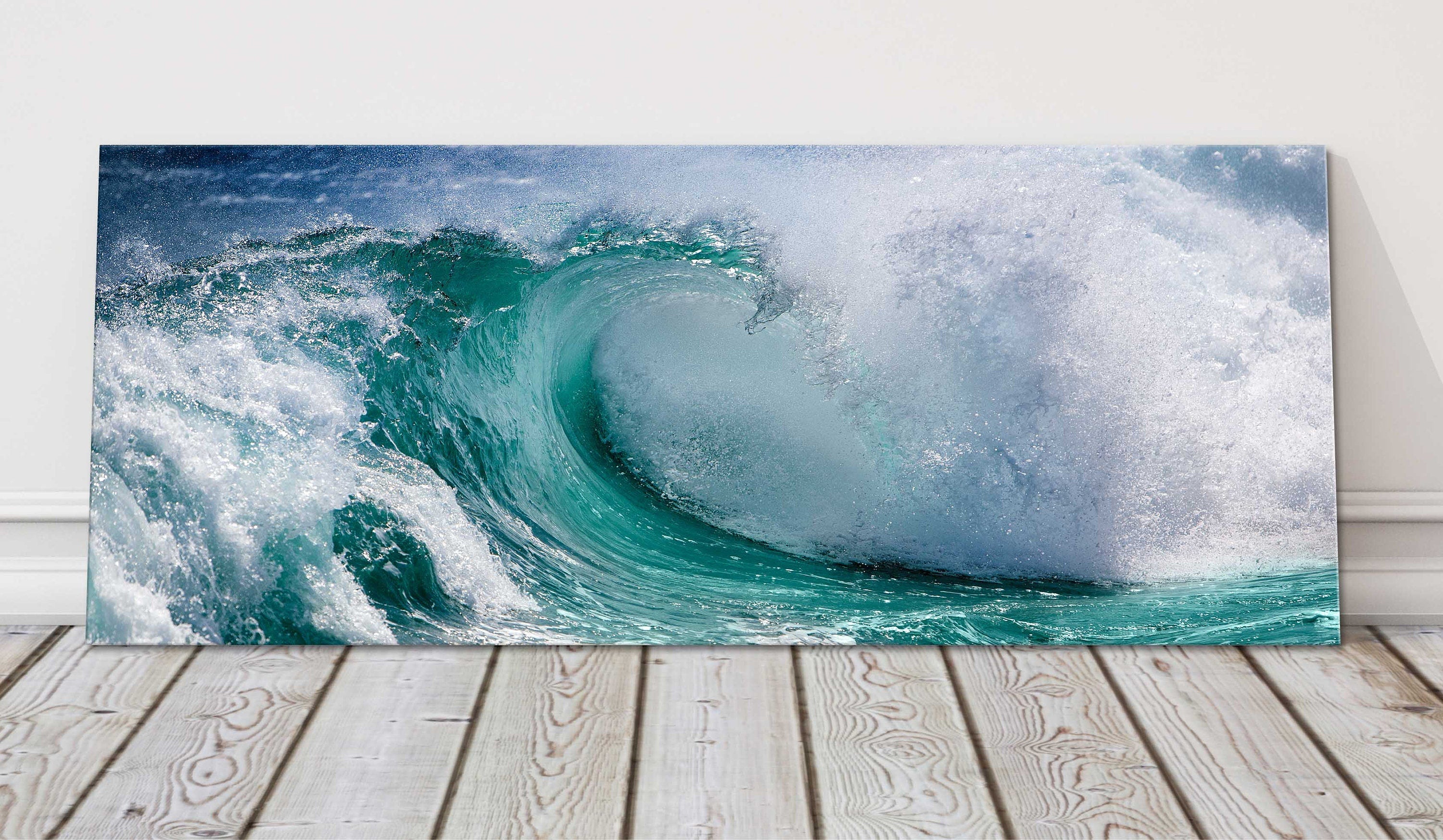 Breaking waves capturing beautiful colours of the sea. Stunning seascape, panoramic canvas picture print.