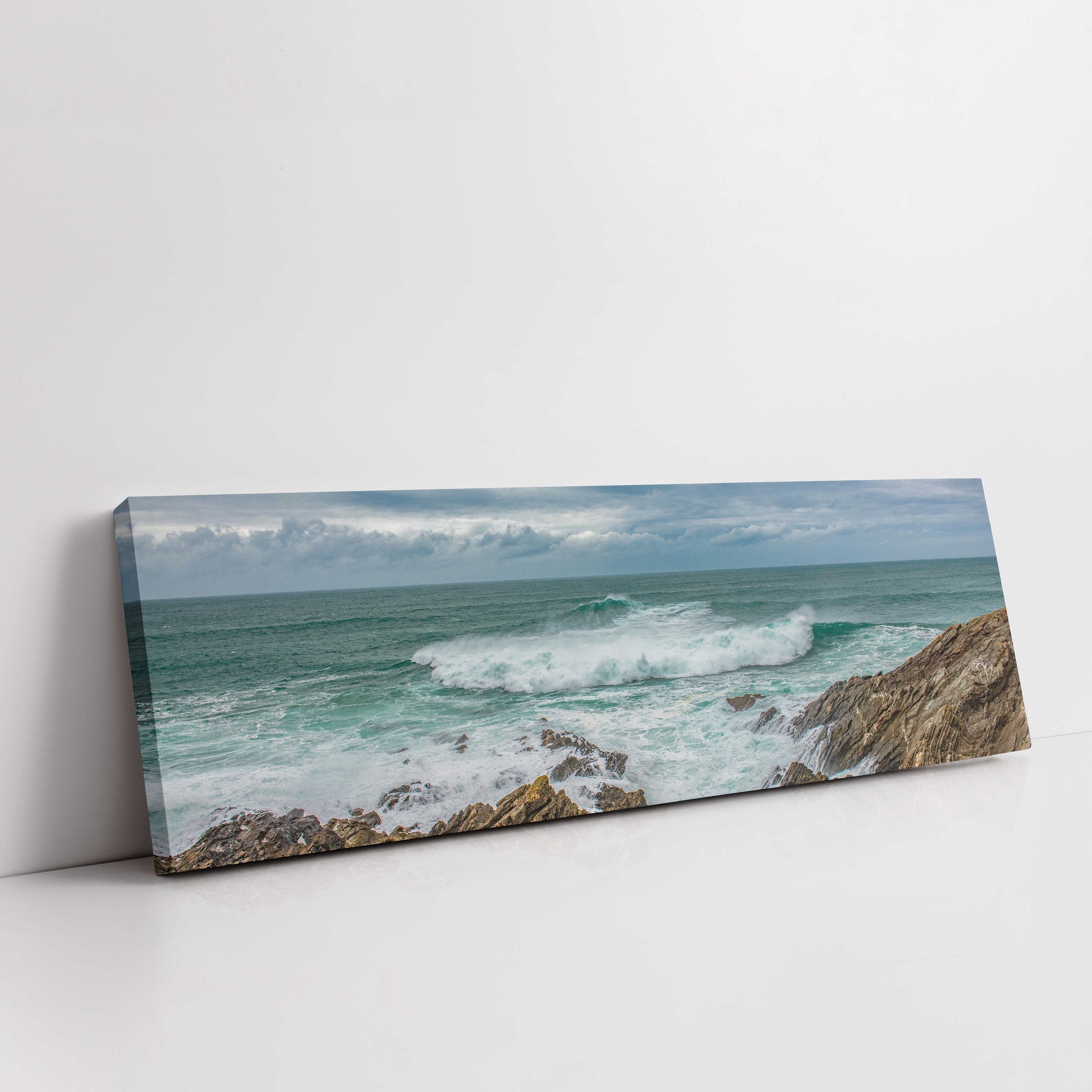 Breaking waves on the rocky Cornish coast. Enjoy the relaxing scene and imagine the sound of the crashing waves. Panoramic canvas picture print. ideal gift. Beautiful colours. Available in a choice of sizes to order.