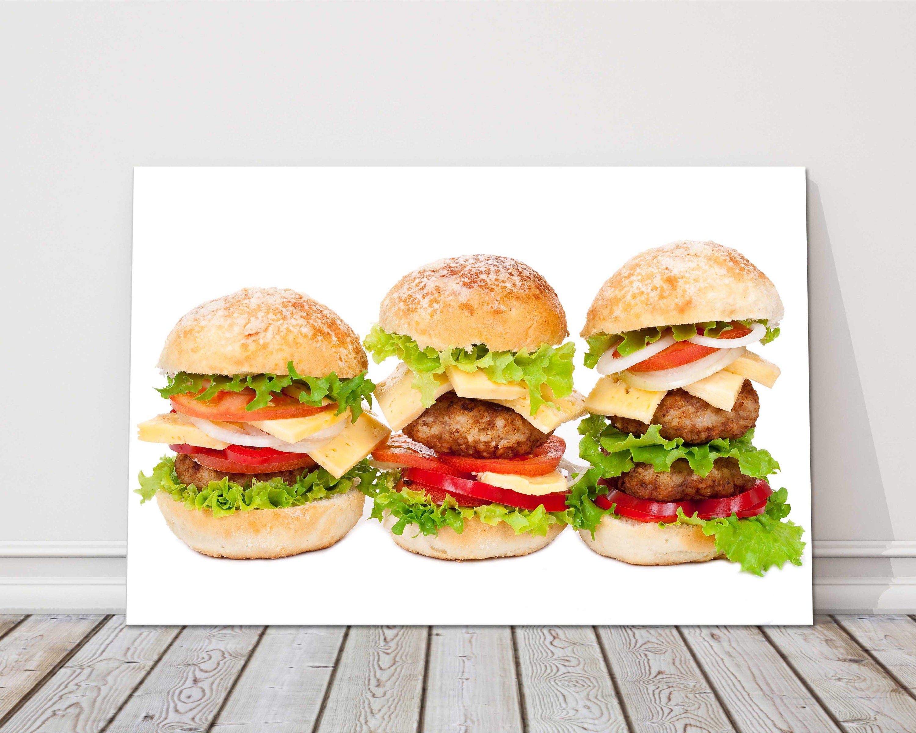 DESCRIPTION Trio of burgers with salad, displayed on a white background, canvas picture, printed and framed as a canvas print.... Read more