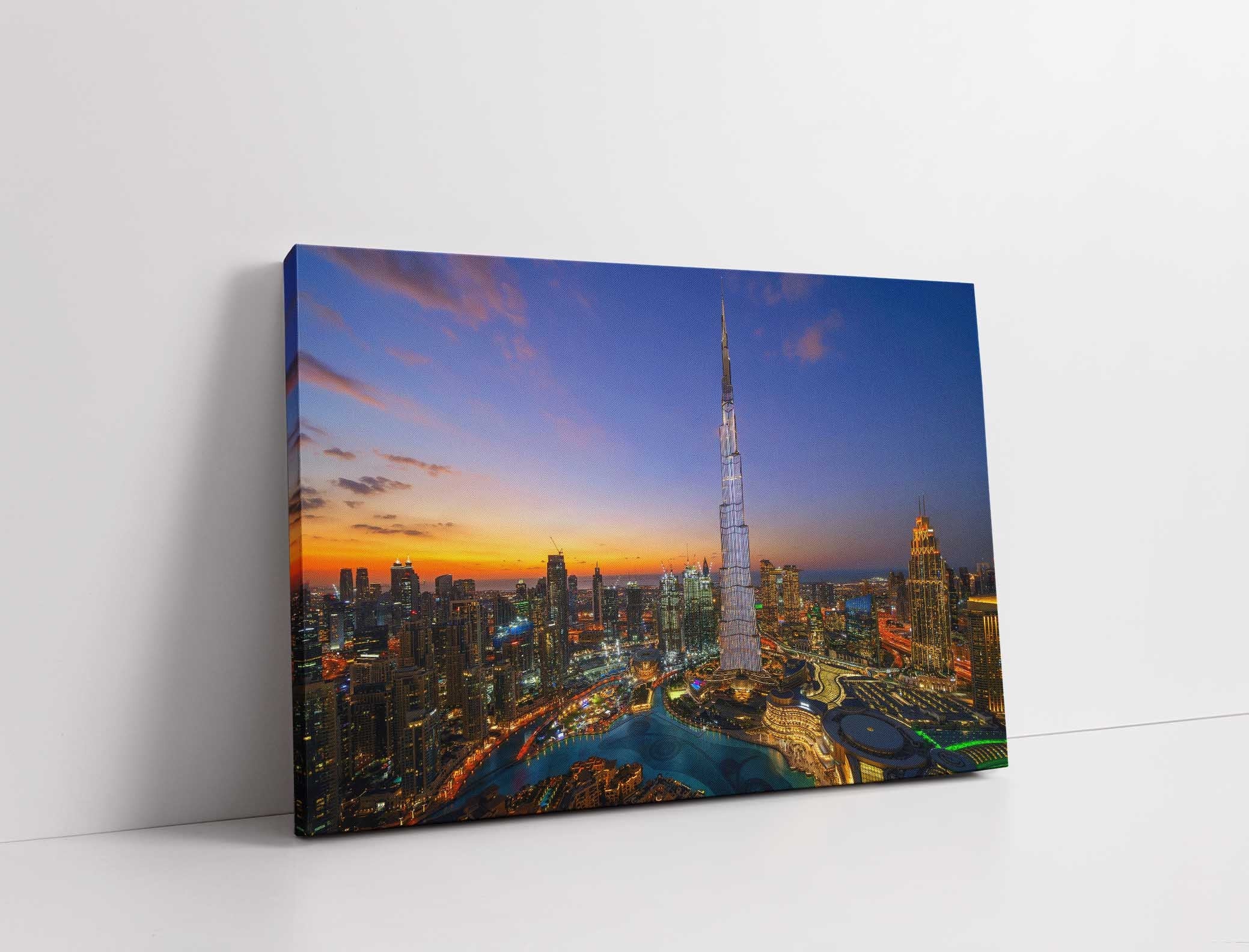 Aerial view of Burj Khalifa in Dubai. Stunning view of the city at night. United Arab Emirates.