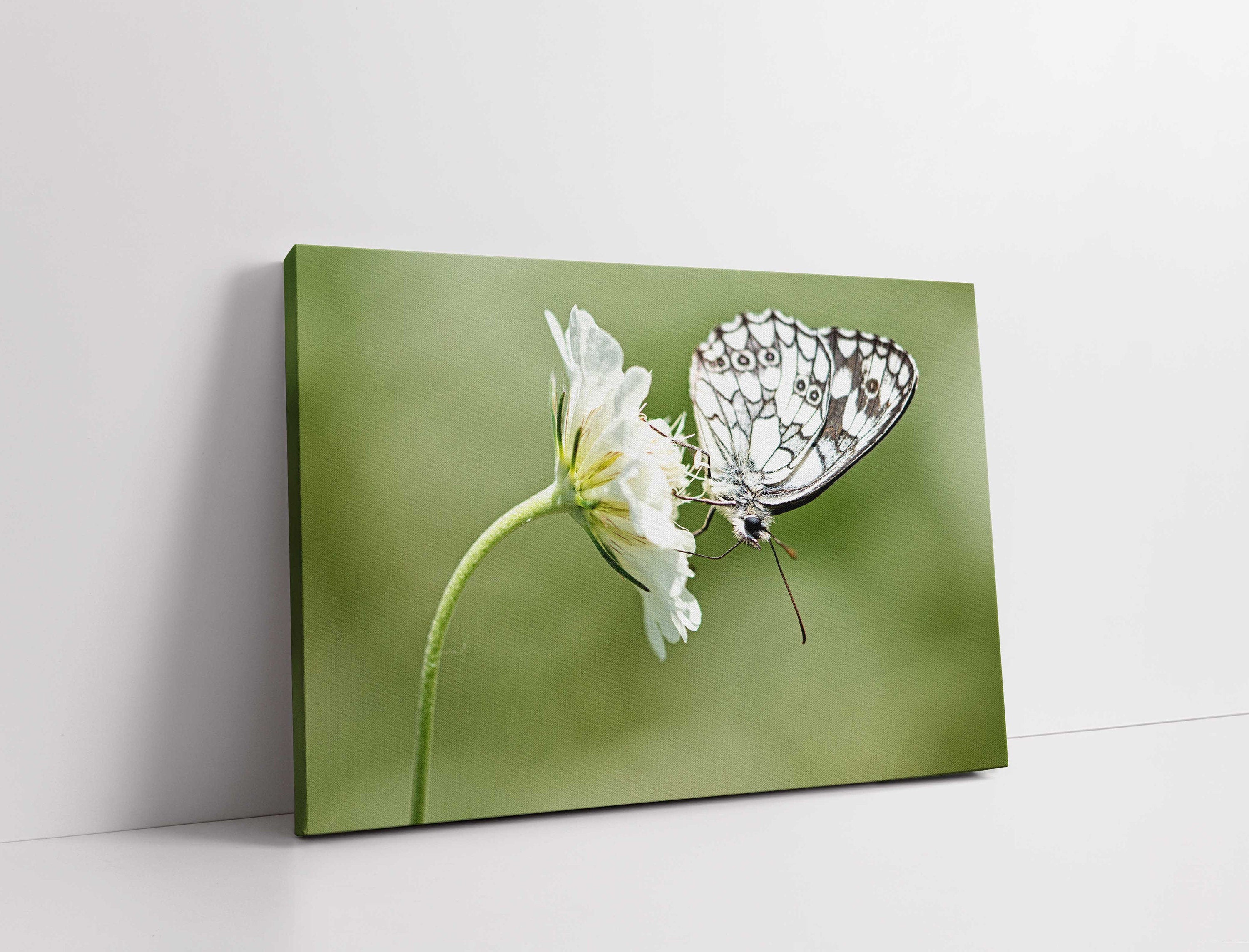 DESCRIPTION butterfly landing on a flower. Green blurred background. Printed and framed as a canvas picture print. Choice of sizes... Read more