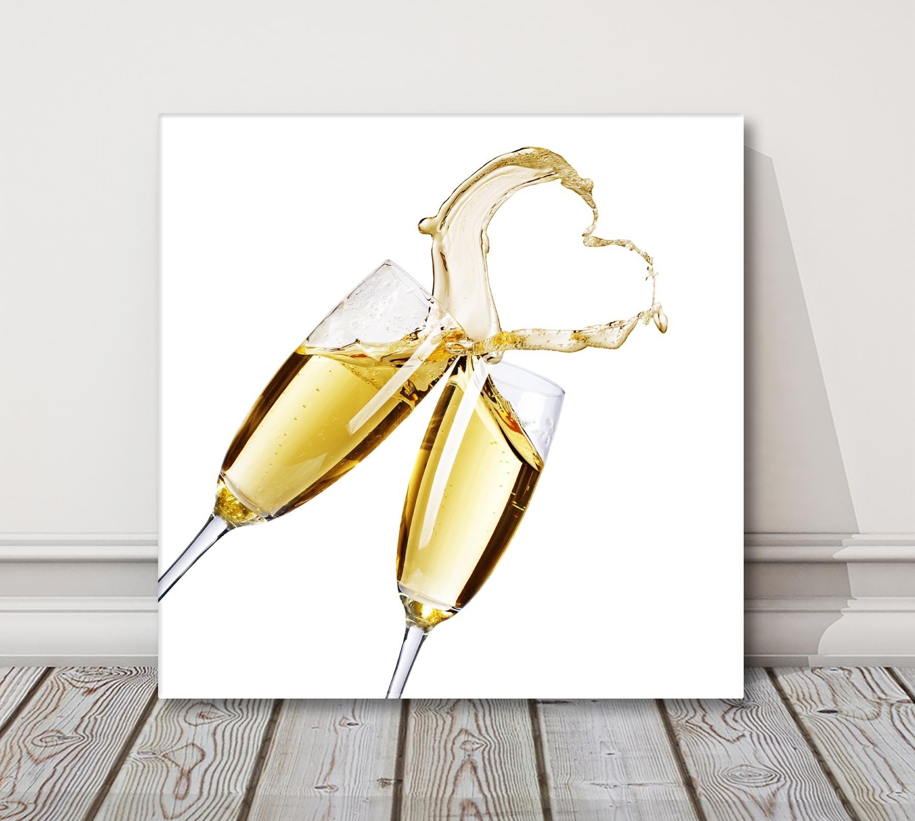 Two champagne flutes with an abstract heart splash, on a white background canvas picture print. Available to order in a choice of sixes. Ideal for ant bar kitchen or restaurant.