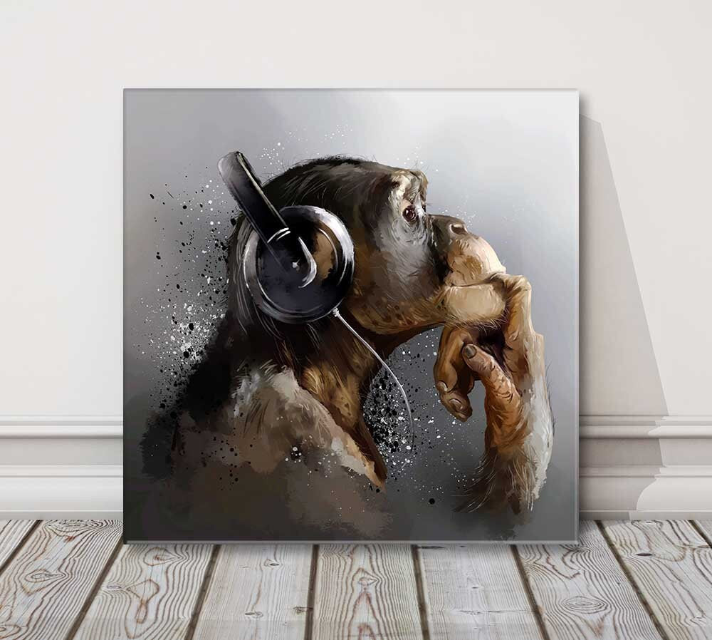 Chimpanzee listening to music. Watercolor drawing. canvas picutre print