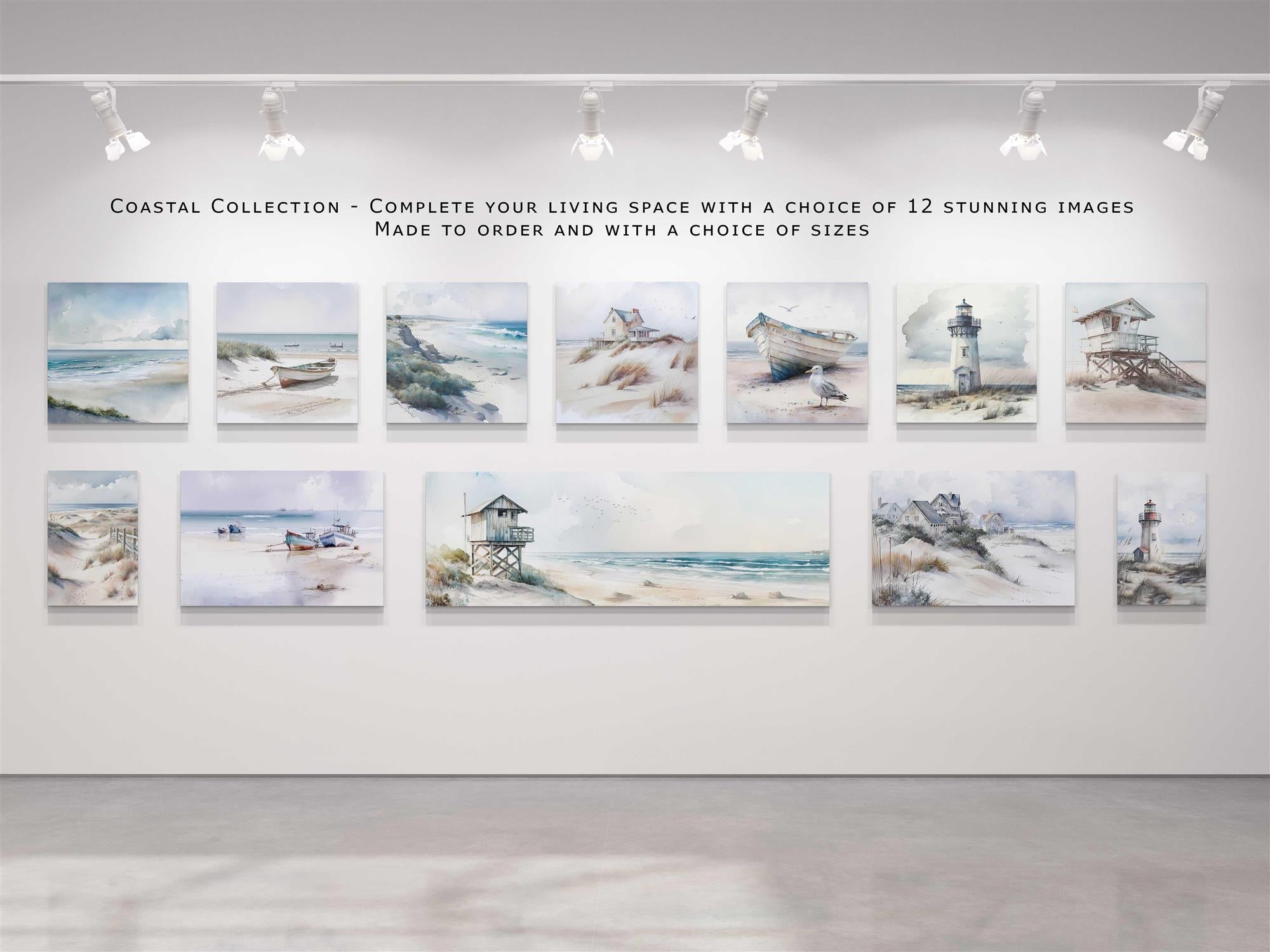 Handmade High-Quality Framed Canvas Picture A choice of 12 pictures to choose from in this coastal art work set. The set includes portrait,landscape, square and panoramic images each piece can be made in different sizes Canvas Quality Overview - Premium Bright White Canvas: Ensures vibrant colors and sharp details. - Kiln-Dried Frames: Prevents warping for long-lasting durability. - Canvas Stretcher Bars: Wraps canvas around the outside of the frame for a modern look - Professional Printing: Utilizes HP printers for gallery-quality prints with accurate colors. - Fade-Free Pigment Inks: Guarantees the best results over time. - Tight Finish: Stretched over a wooden frame for a drum-tight appearance. - Protective Backing: Taped at the back to safeguard your walls from staples. - Frame Thickness Options: Choose between 18mm thin or 38mm deep frames. Benefits of Canvas Prints - Lightweight: Easier to hang and transport compared to traditional framed prints. - No Glare or Reflections: Enjoy uninterrupted viewing without distracting reflections, making them ideal for any lighting situation. - Cost-Effective: Get larger sizes at a similar price compared to smaller framed prints, allowing for impactful displays without breaking the bank. Canvas prints combine quality with practicality, making them a smart choice for showcasing your favorite artwork or photos! Customization Available: All canvas prints are made to order. If you have specific size requirements, color changes (like black and white), or want to add text, just reach out! Our Commitment: As a small family business, we prioritize quality and value for money. Let us help you create a piece that you'll cherish!