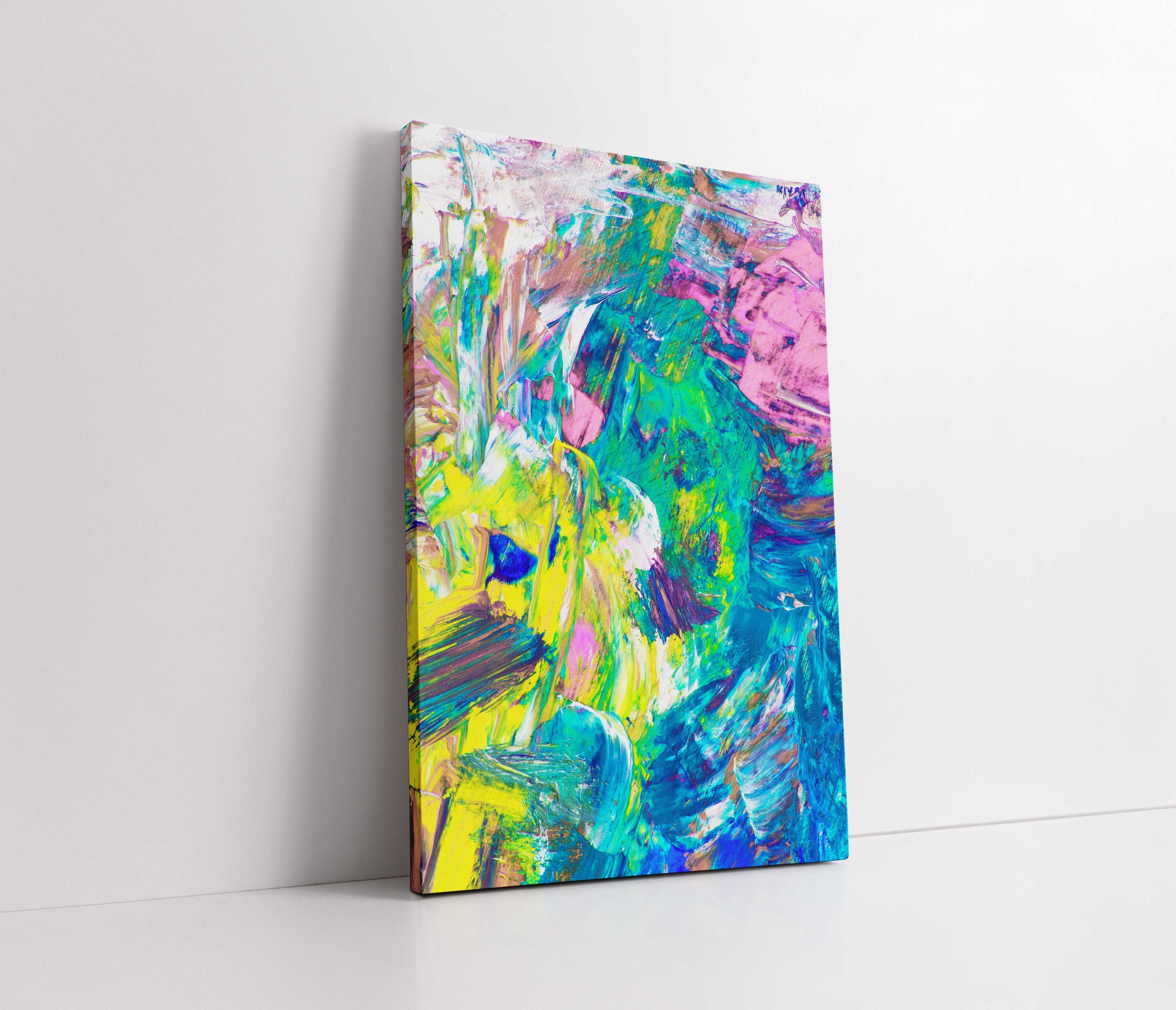 Colourful abstract image. Ideal gift for any home. Contemporary design. Bright multi-coloured brush strokes. Yellow, blue, green and purple. Choice of sizes available.