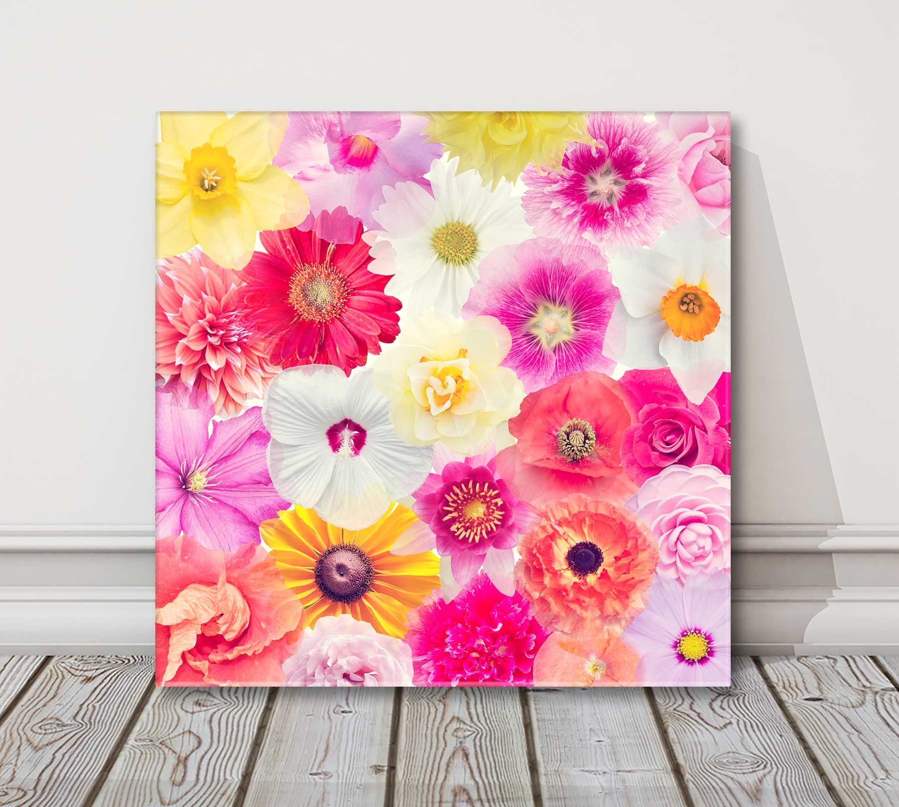 Flower heads close up. Bright colourful pink, white and yellow flower heads, printed as a canvas picture print. A choice of sizes available to order.