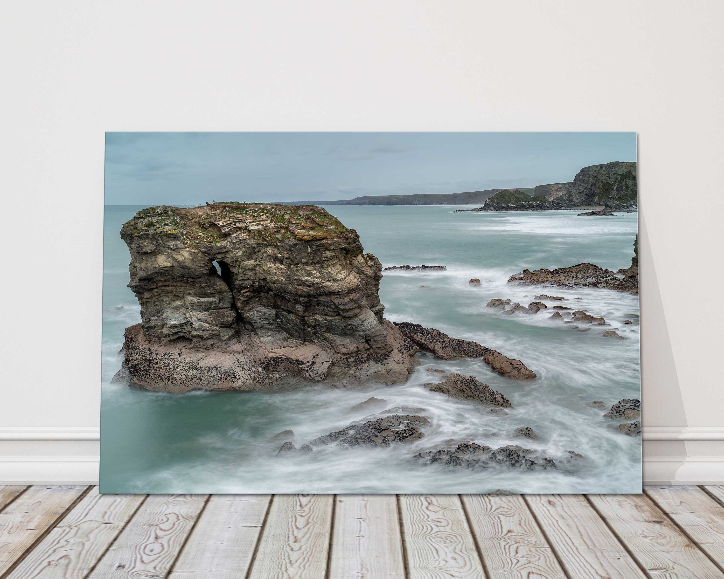 Coastline view near Newquay. Waves swirling around Rocks, Porth Island, Cornwall. Canvas picture print. Available to order in a choice of sizes.