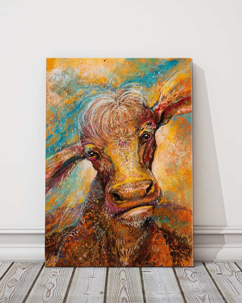 Cosmic cow wall art canvas picutre print portrait brown with a yellow and blue background