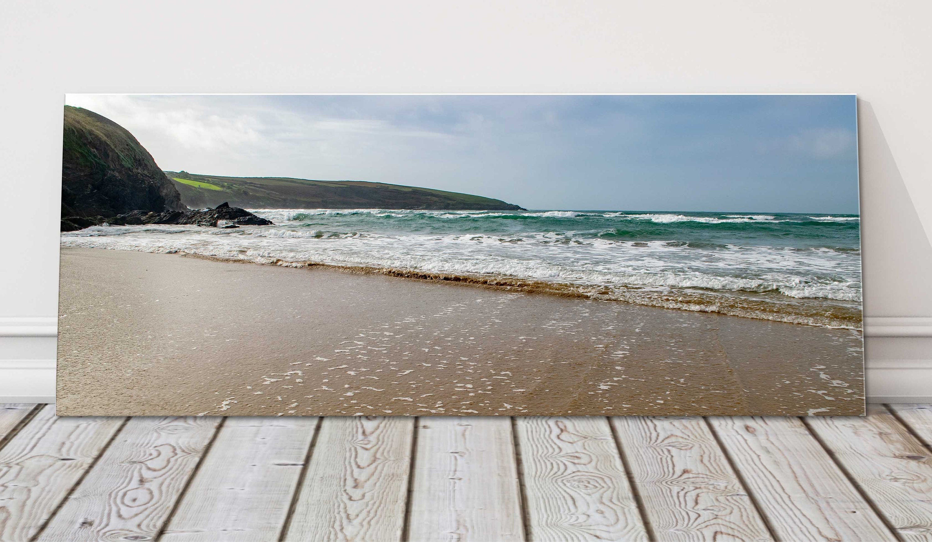 Crantock beach as the tide comes in, capturing beautiful colours of the sea. Stunning seascape panoramic canvas picture print. Available in a choice of sizes.