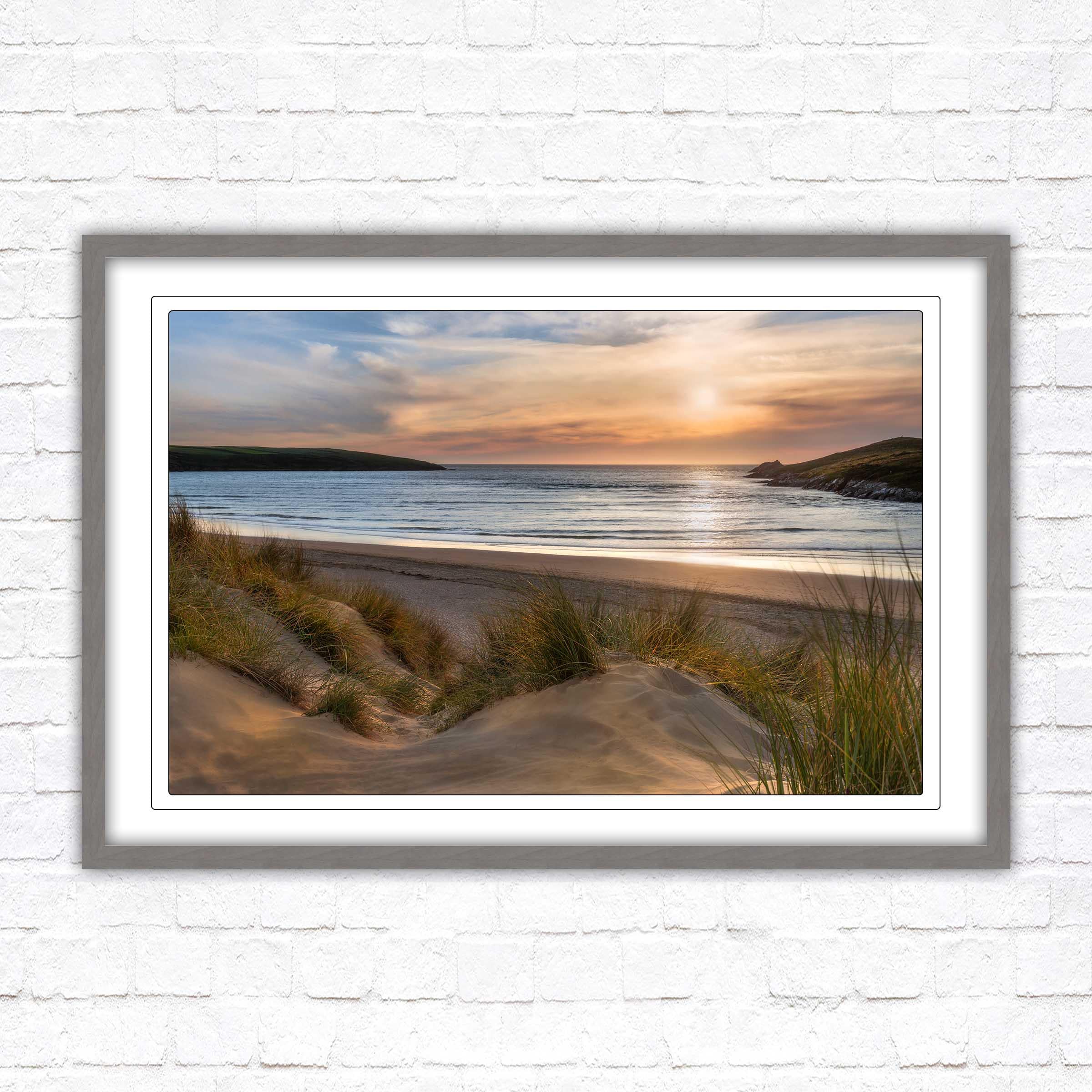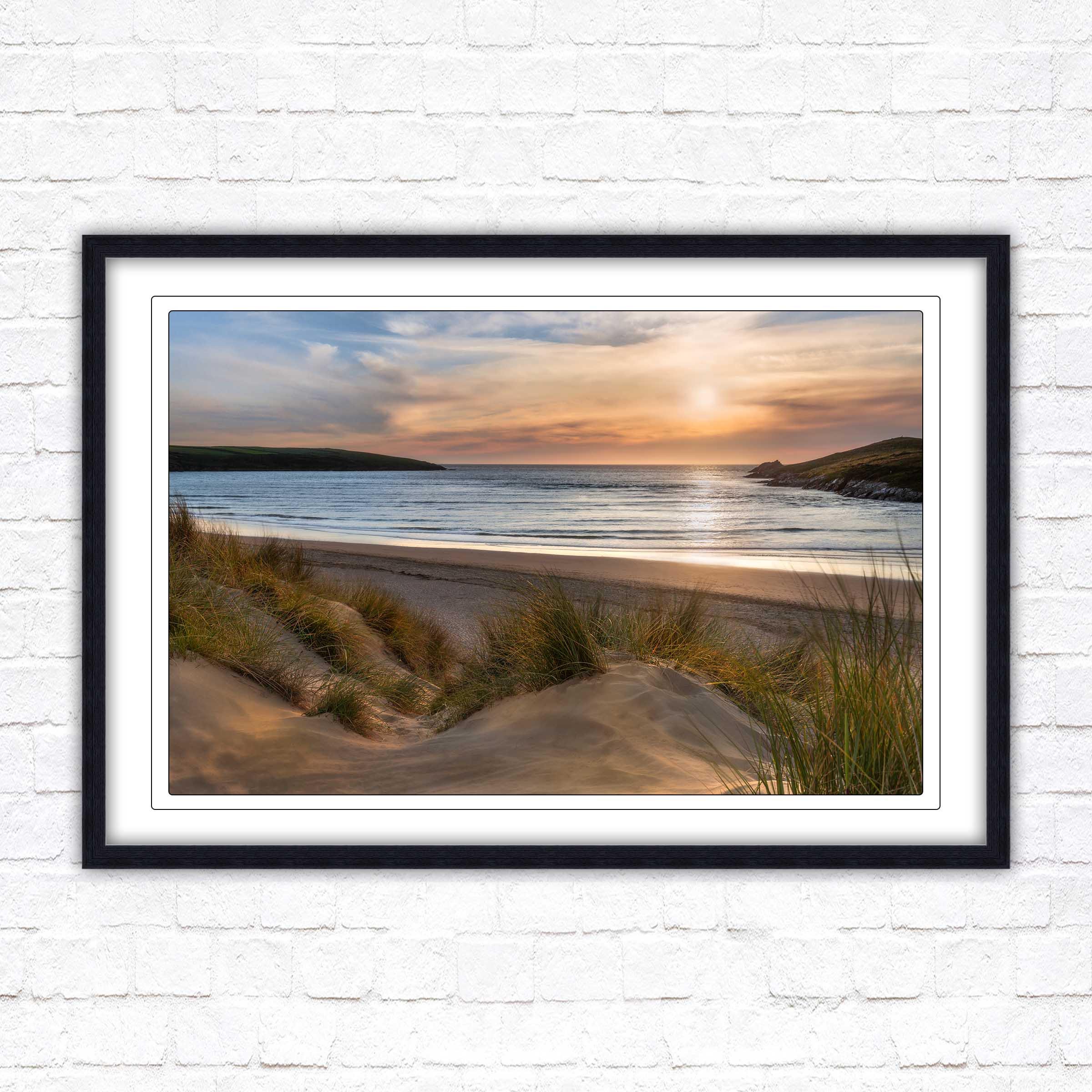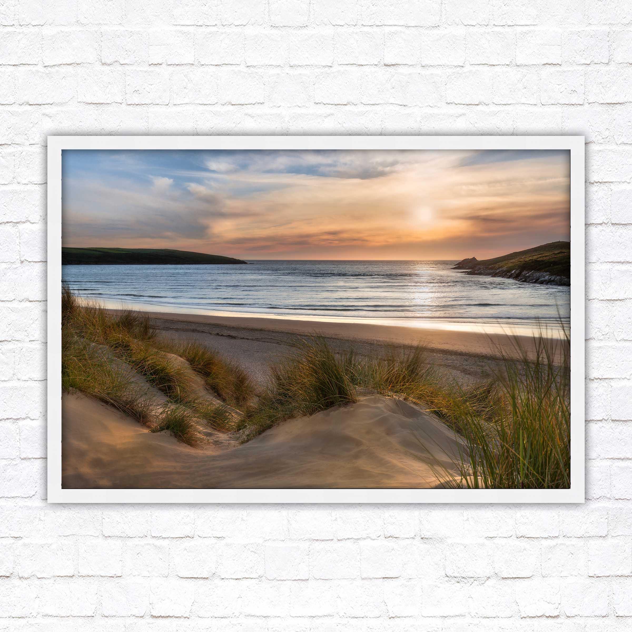 Sunlight over the sand dunes. Crantock beach, Cornwall. Framed picture. Choose from a selection of frame styles.