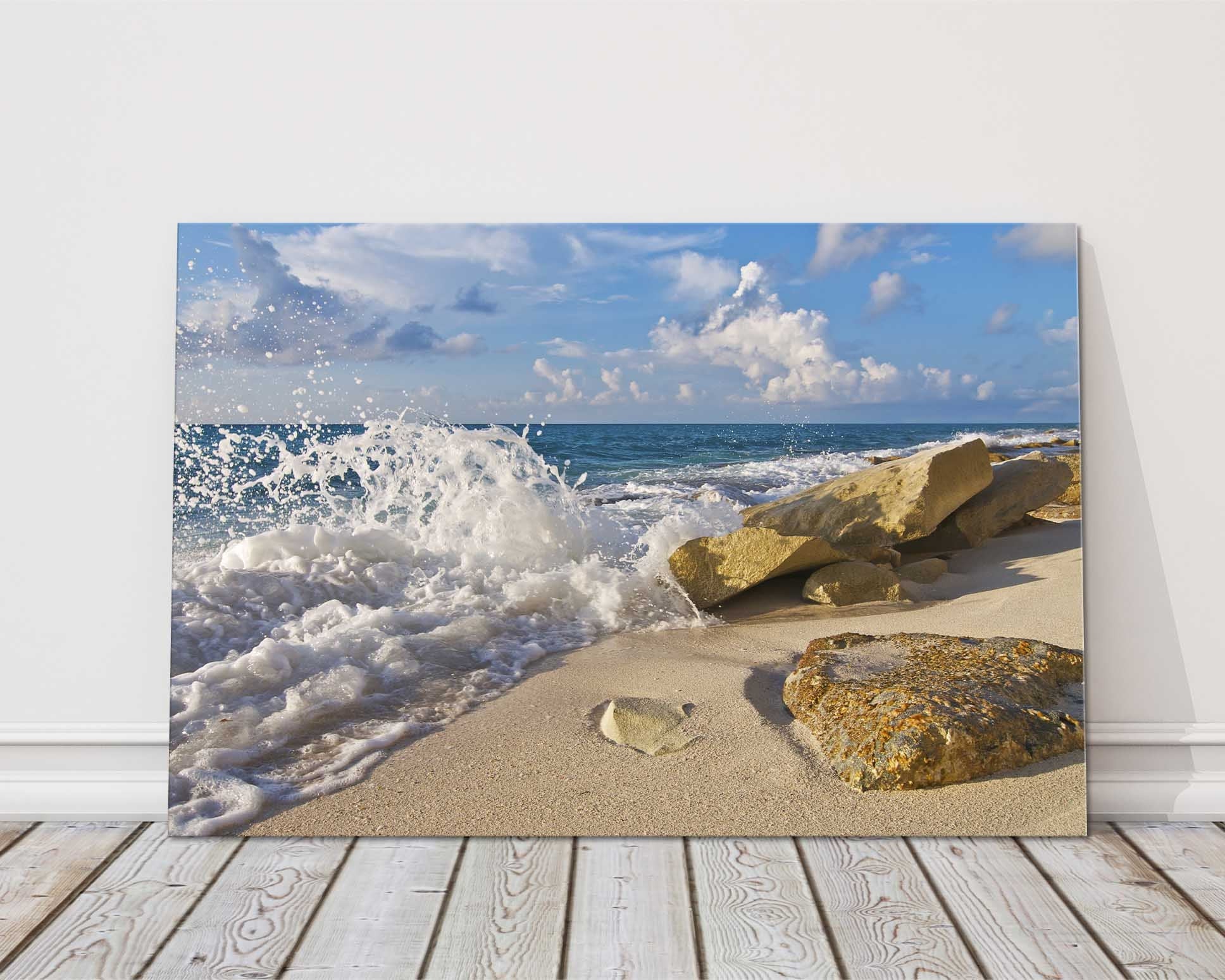 Crashing waves on the rocks, bright sunny day canvas picture print.