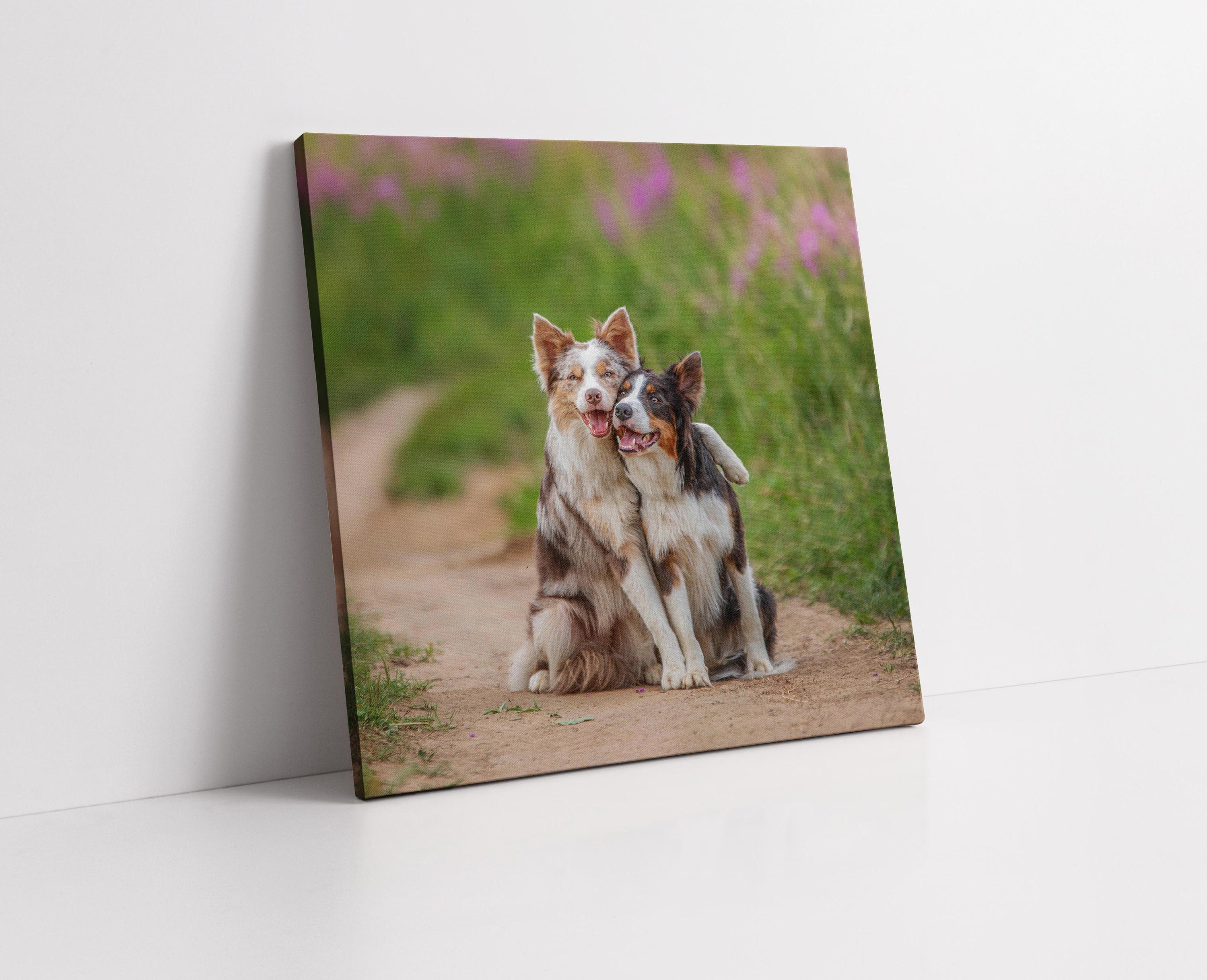 Cute dogs hugging. Heart warming picture of two loving pets set on a country lane. Canvas picture print, available in a choice of sizes.