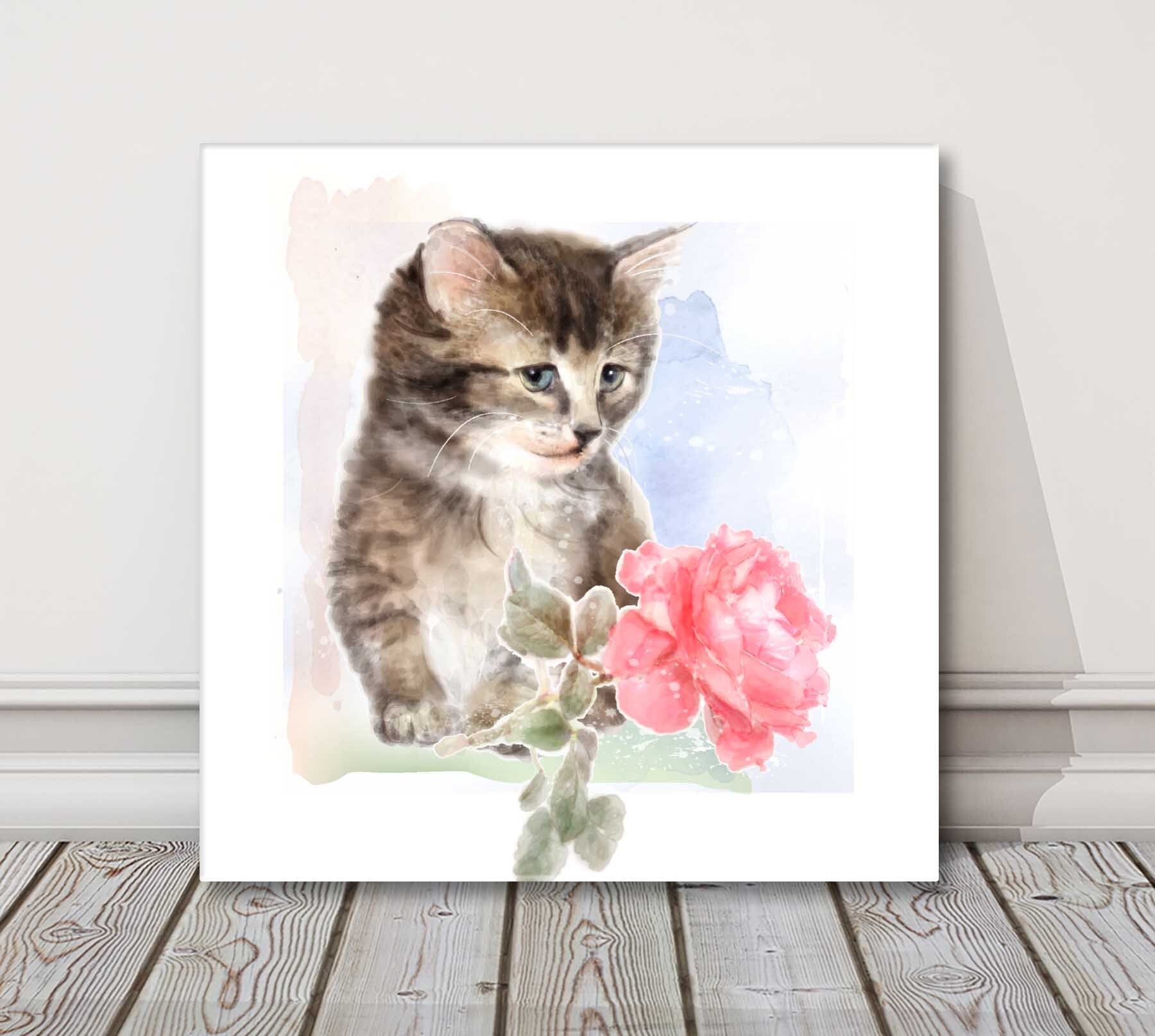 Cute tabby kitten pictured with a flower. Cat/animal lovers. Printed and framed as a canvas picture print. Available to order in a choice of sizes.