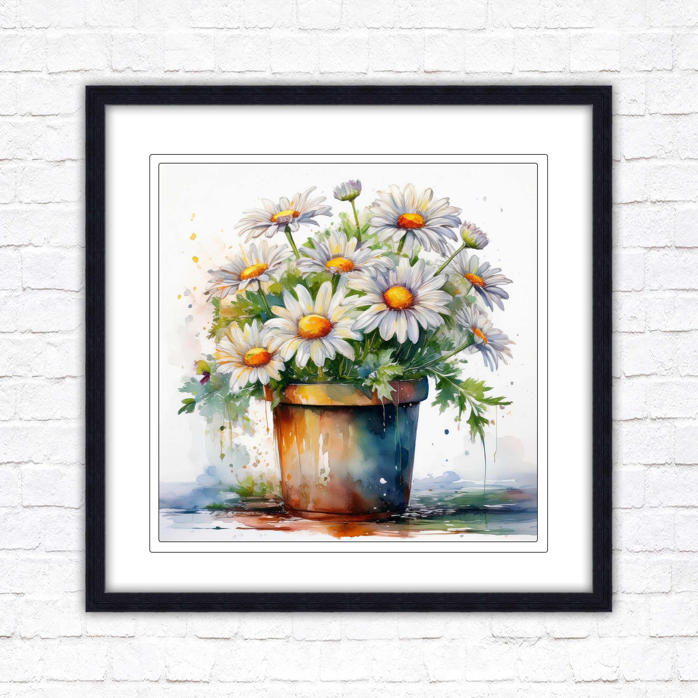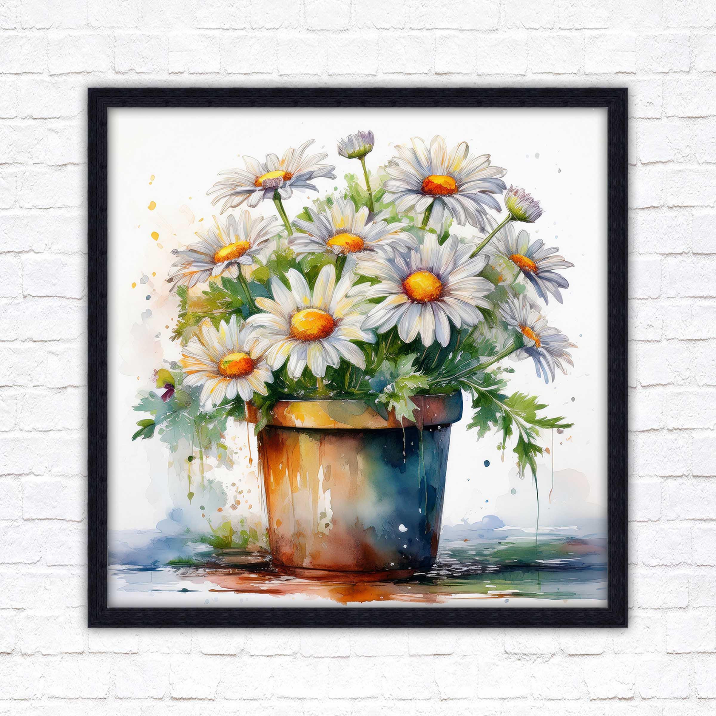 Add a touch of natural beauty and timeless charm to any room with this stunning framed picture of a vibrant potted daisy plant. Perfect for brightening up your living room, office, or hallway, this artwork brings the serene elegance of nature indoors.