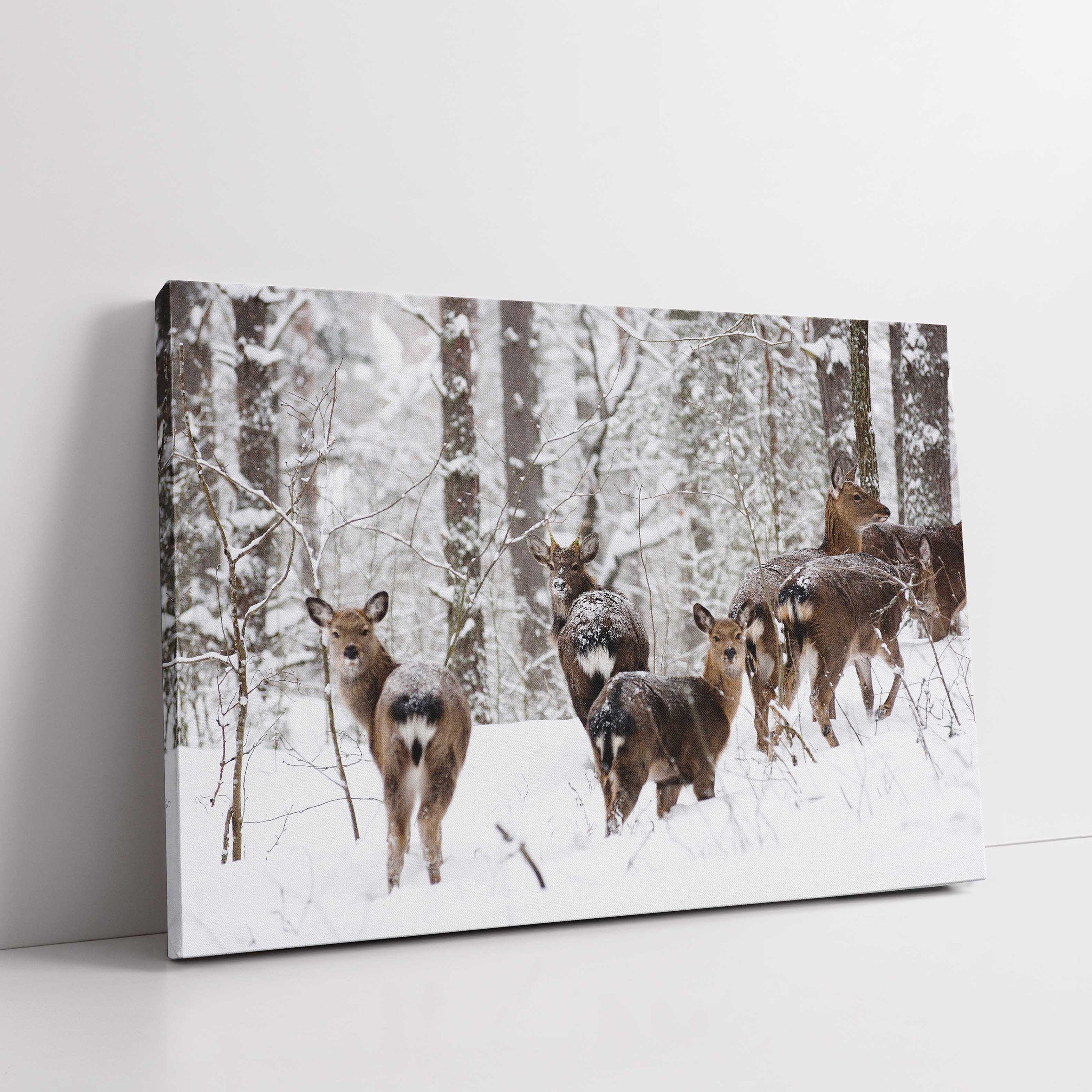 DESCRIPTION Spotted Cervus deer family in a snow covered forest. Beautiful scenic image, Printed and framed as a canvas picture... Read more