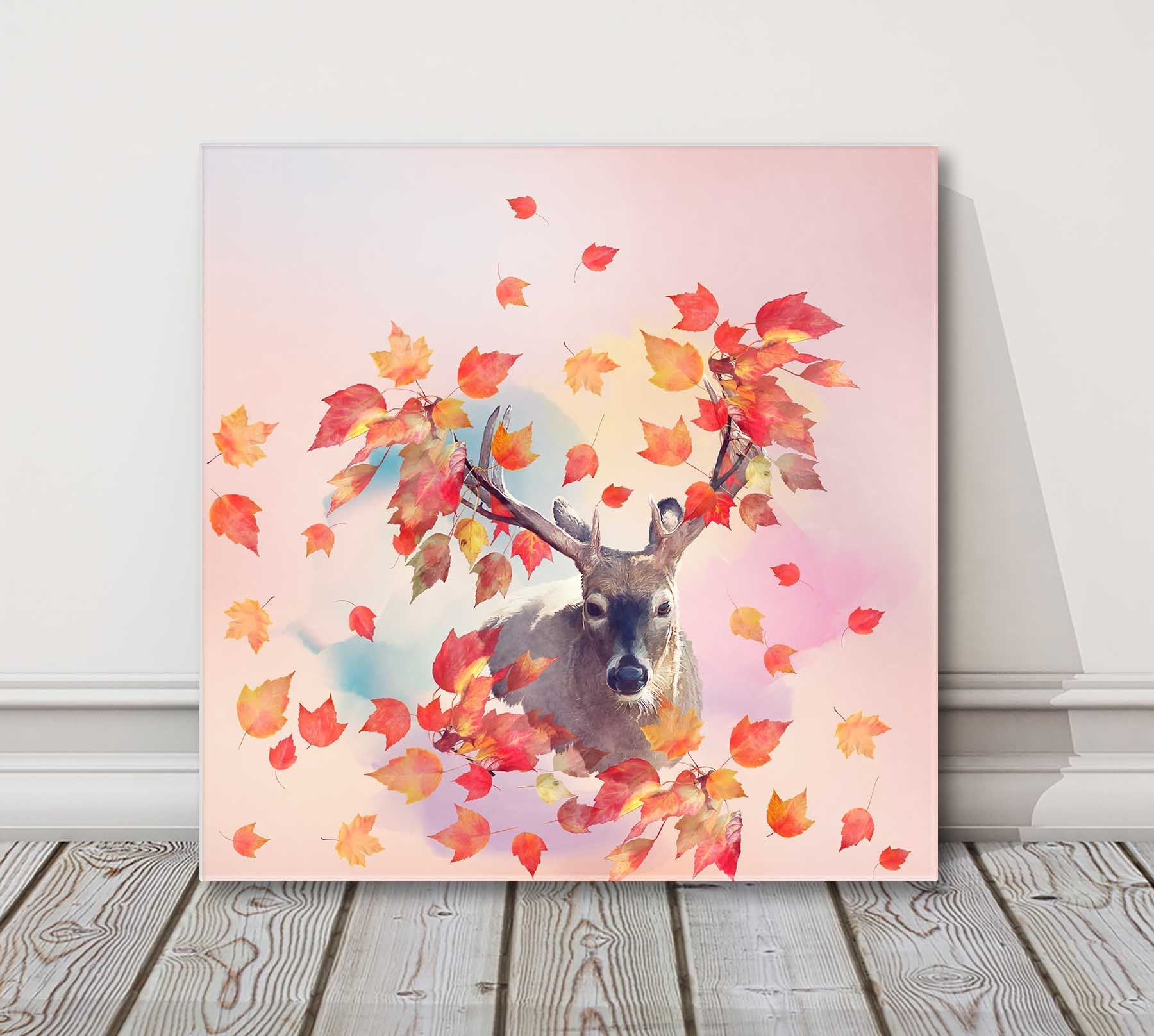 Deer portrait with Autumn leaves. Canvas picture print. Wall art in warm autumnal colours. Wildlife image. Square print available in a choice of sizes.