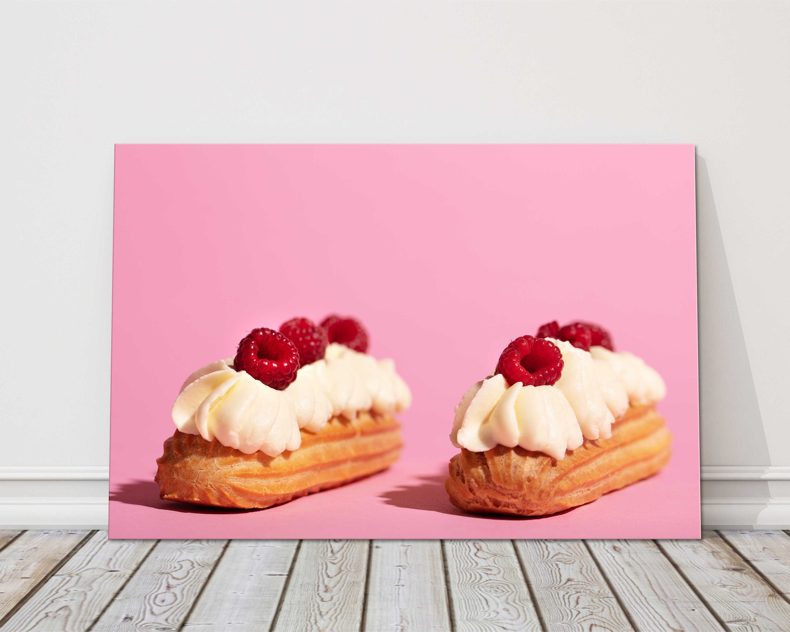Two Raspberry cream eclairs, displayed on a pink background. Printed and framed as a canvas print. Fun for children. Food... Read more