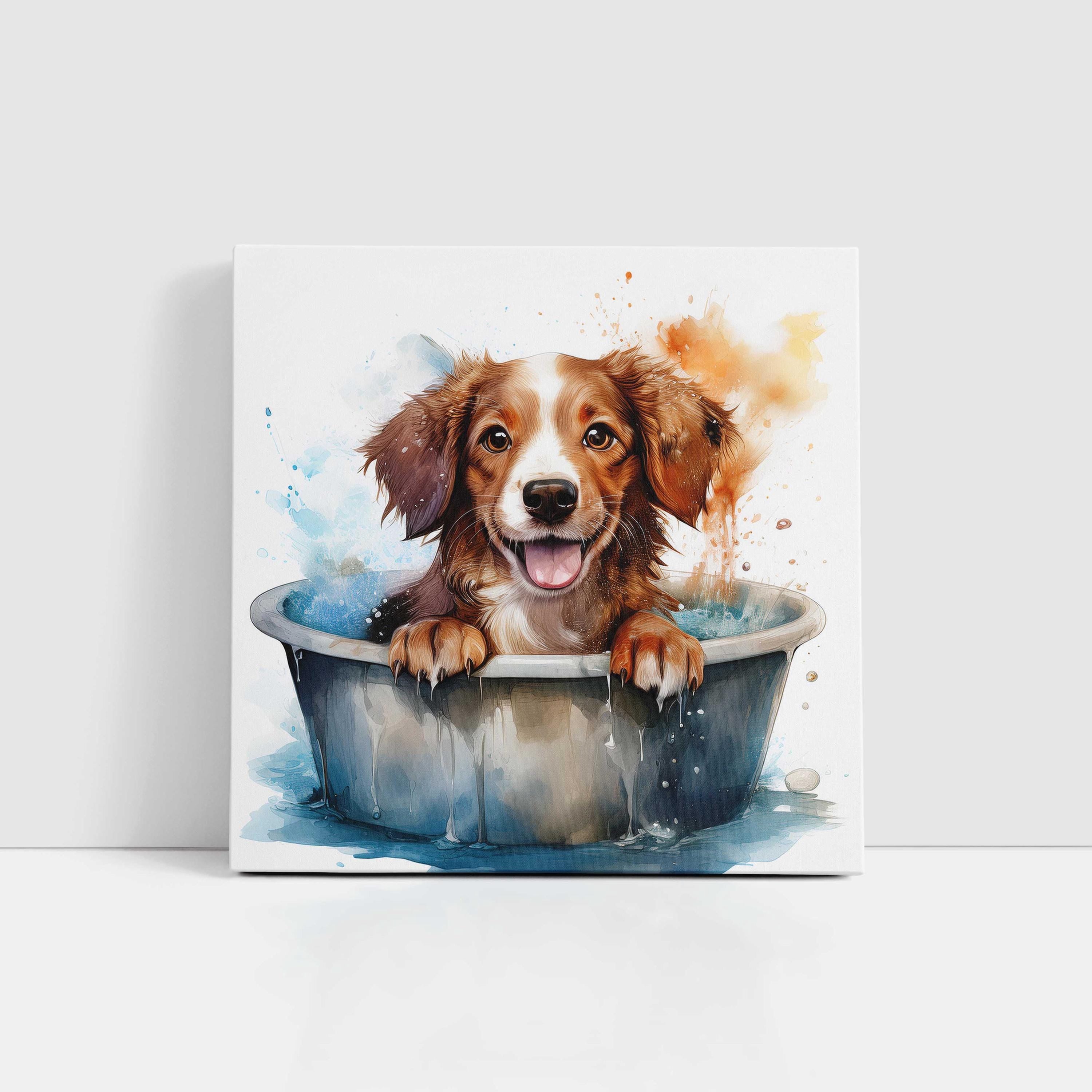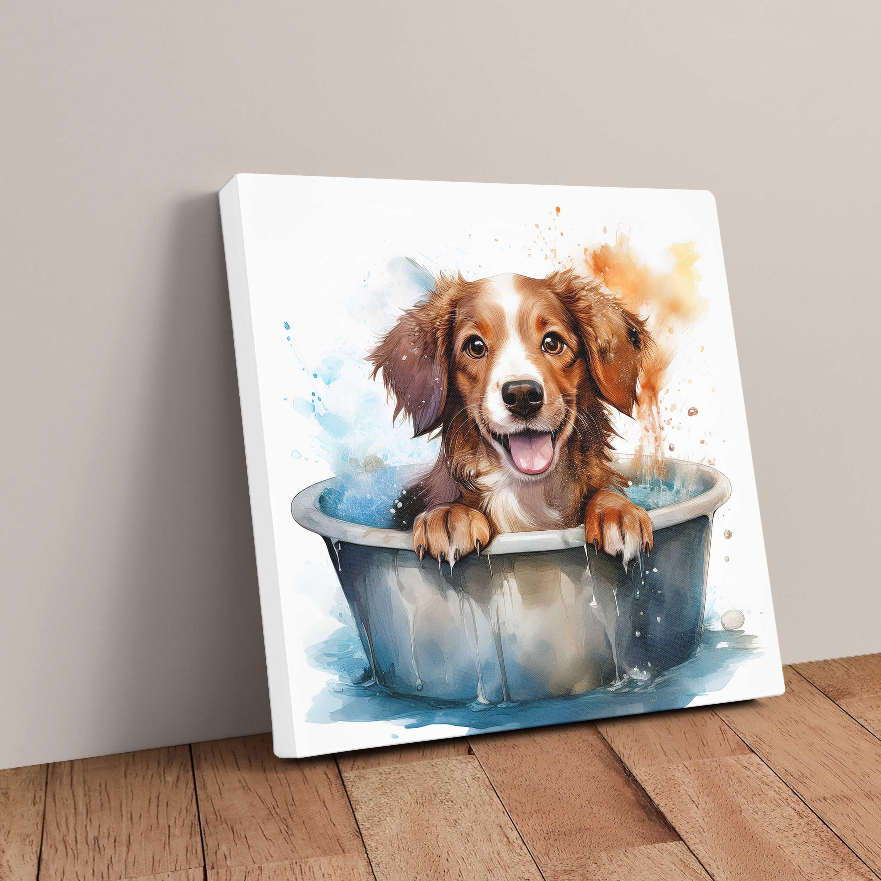 Dog in the bath Colourful watercolour cute canvas picture print. Wall art. Available in a choice of sizes.