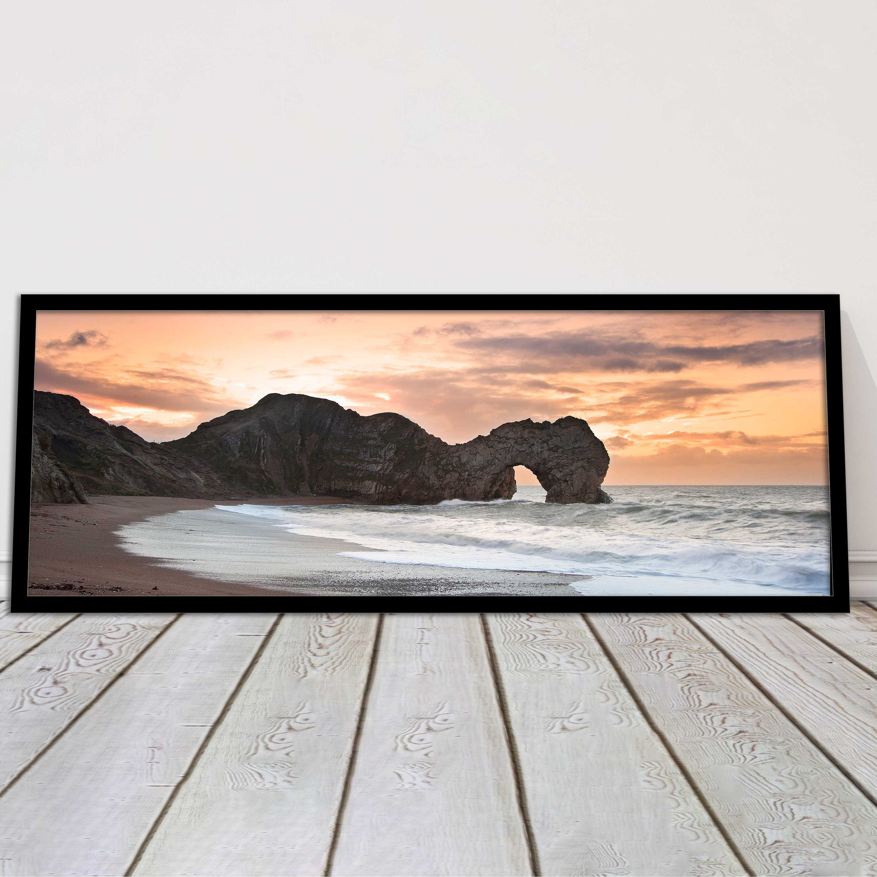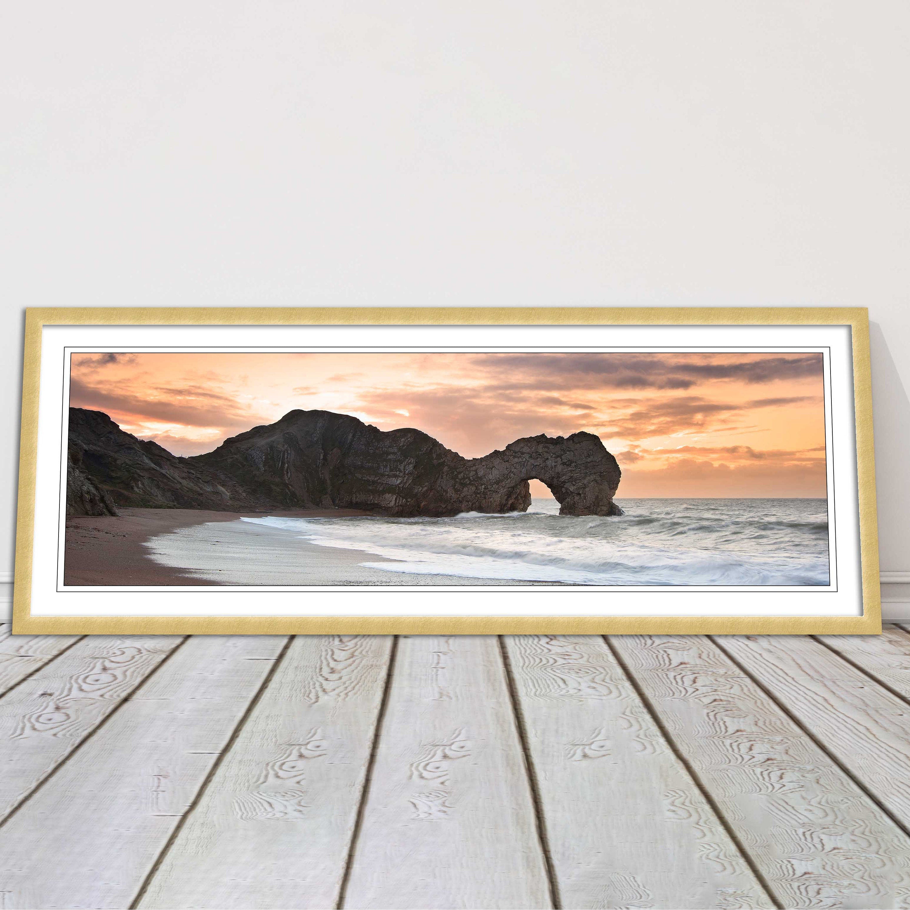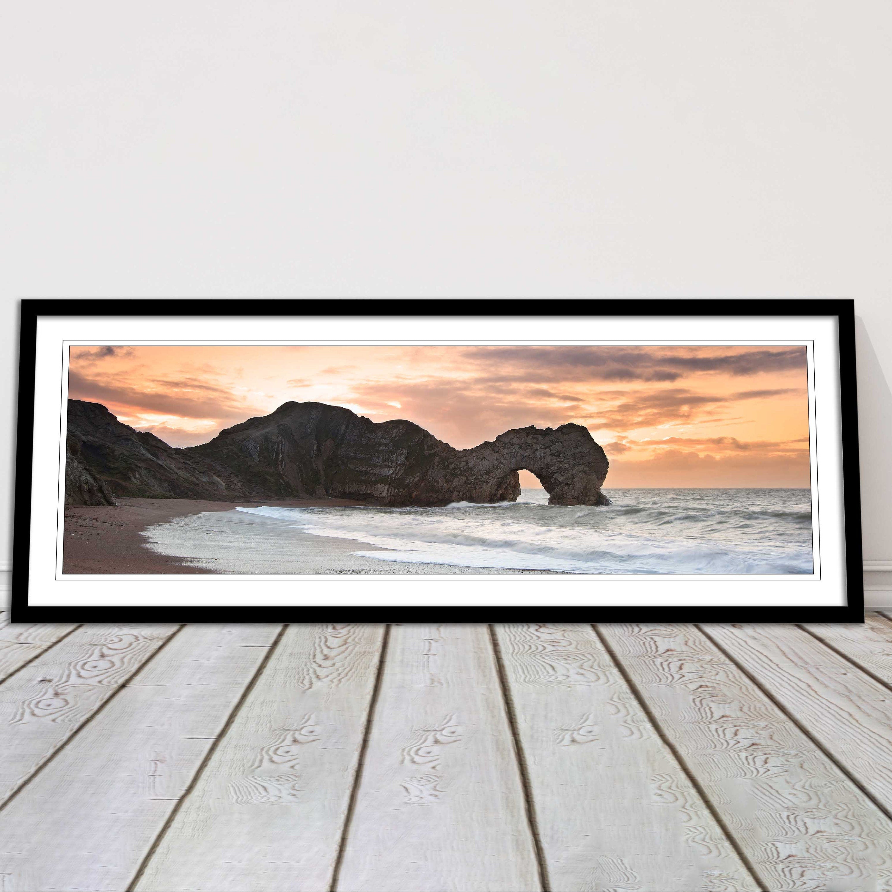 A beautiful panoramic framed picture of Durdledoor at sunset. Dorset coastline. A choice of frames available.