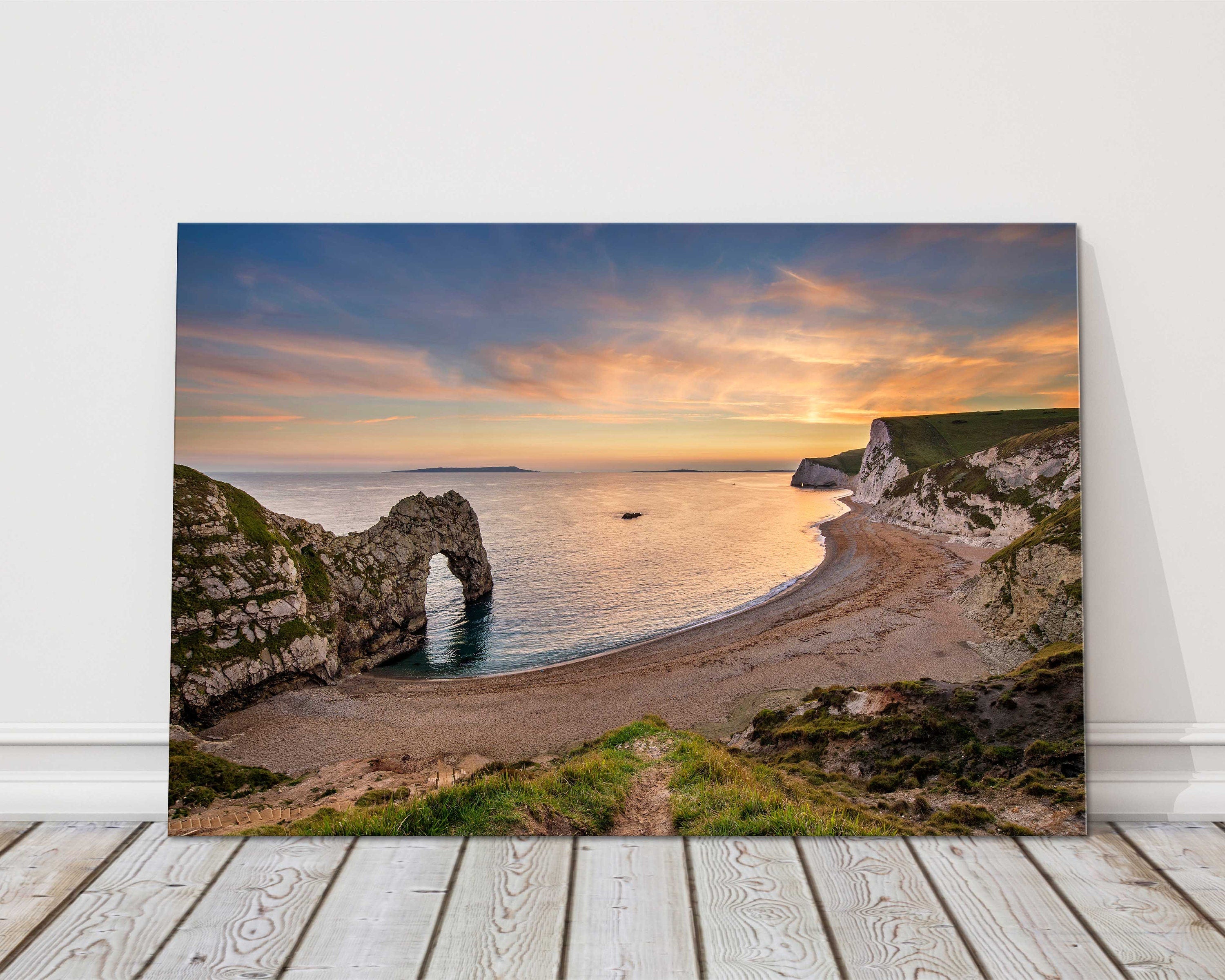 Landscape view of Durdle Door on the Jurassic Coast at sunset. Stunning coastal landmark image. Canvas picture printed and framed... Read more