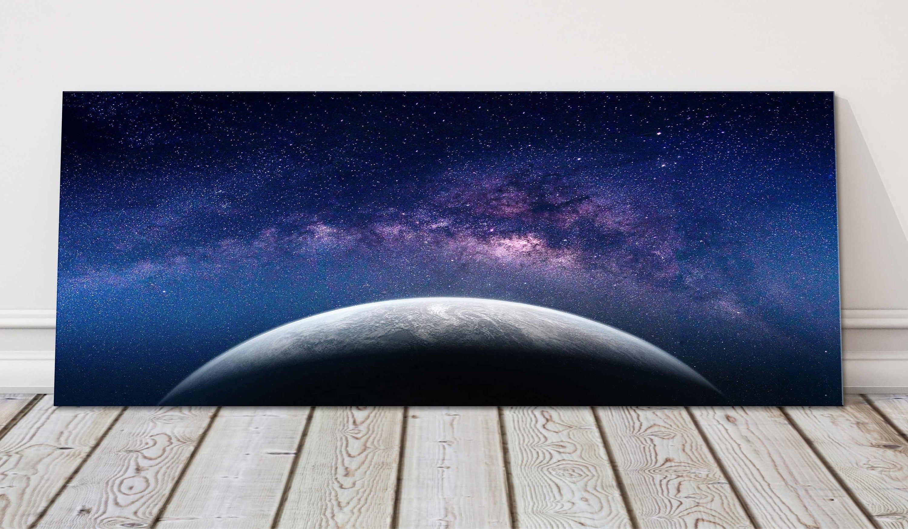 View of Earth and the Milky Way Galaxy from space. Panoramic canvas picture print. Lovely deep blue and purple colours over the Earth. Print available to order in a choice of sizes.