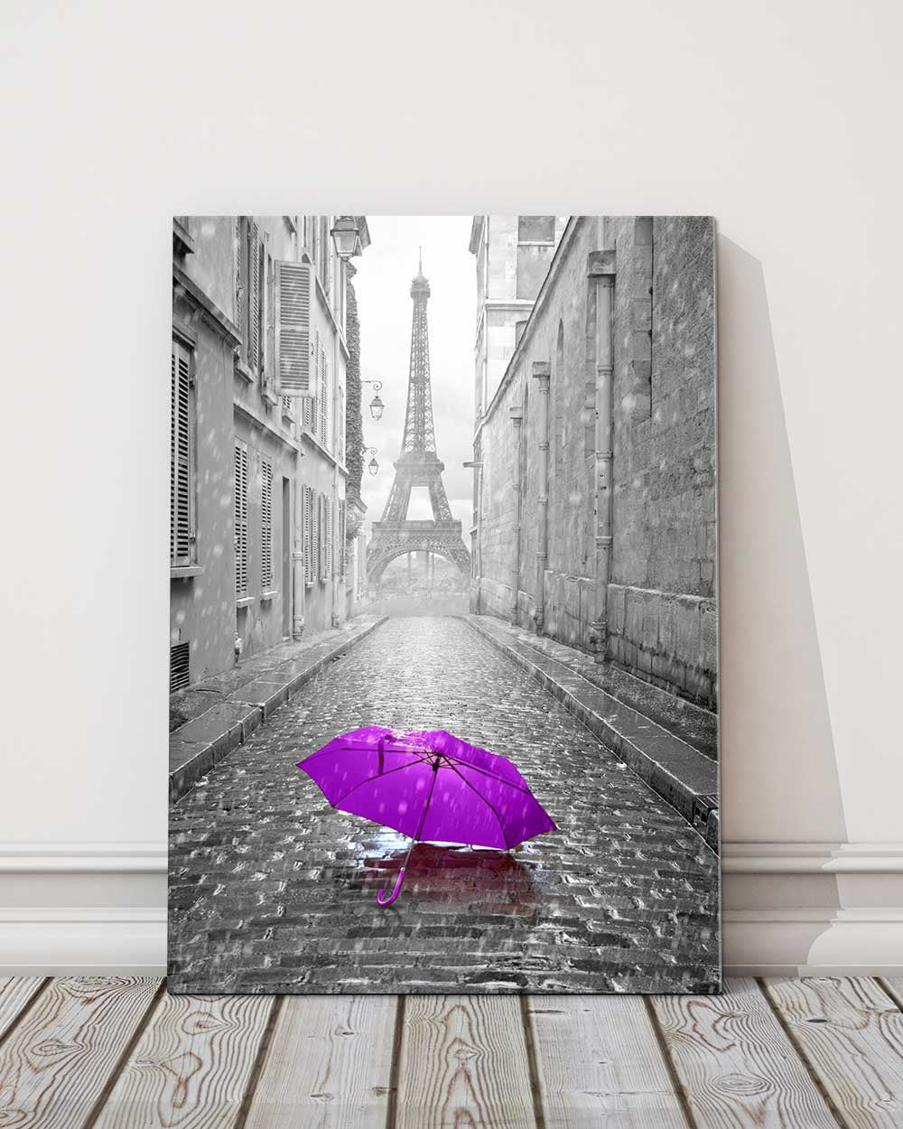 Eiffel Tower, Paris, France Black and white purple umbrella. Modern canvas print