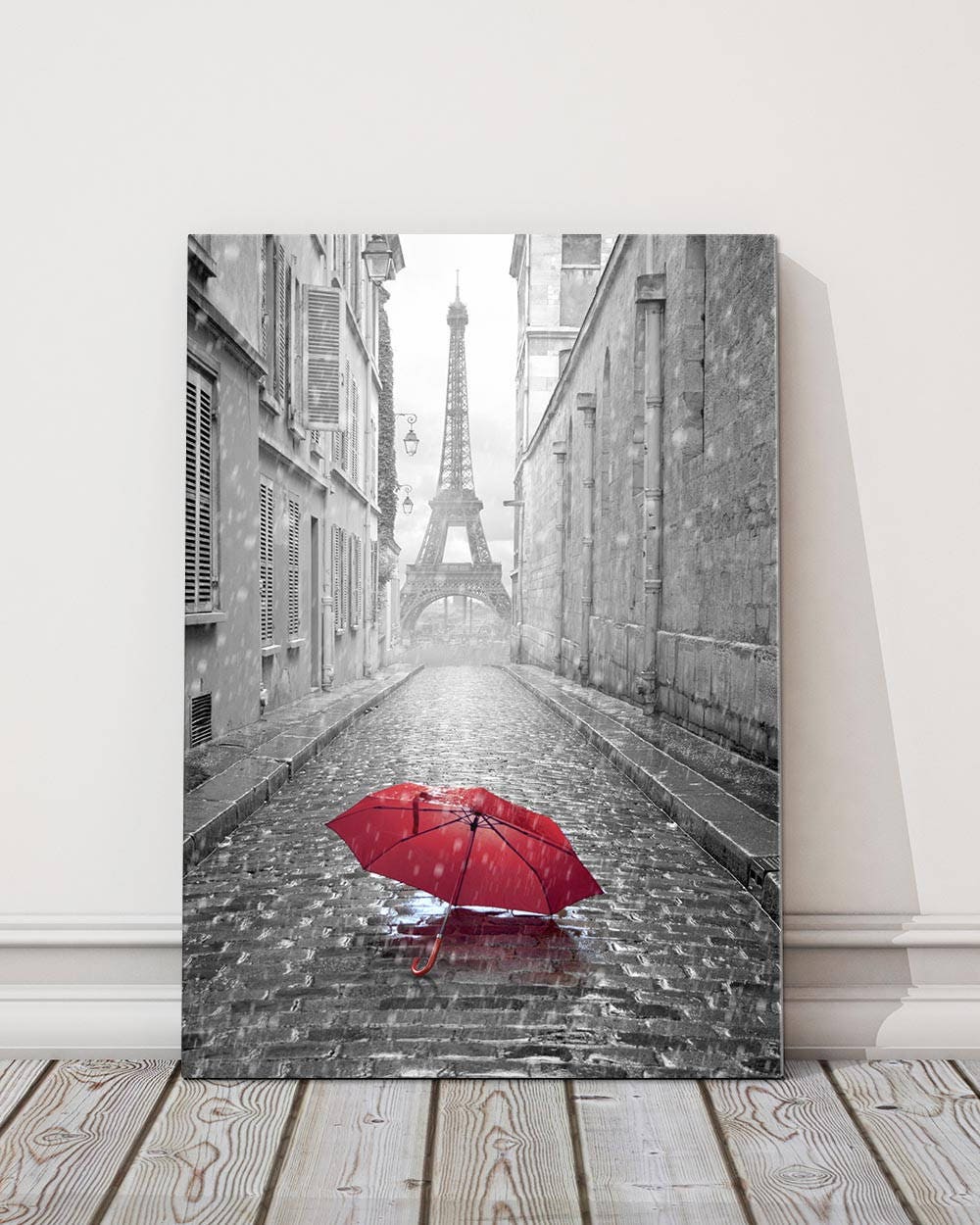 Red umbrella on a street in Paris with a view of the Eiffel Tower. Red on a black and white... Read more