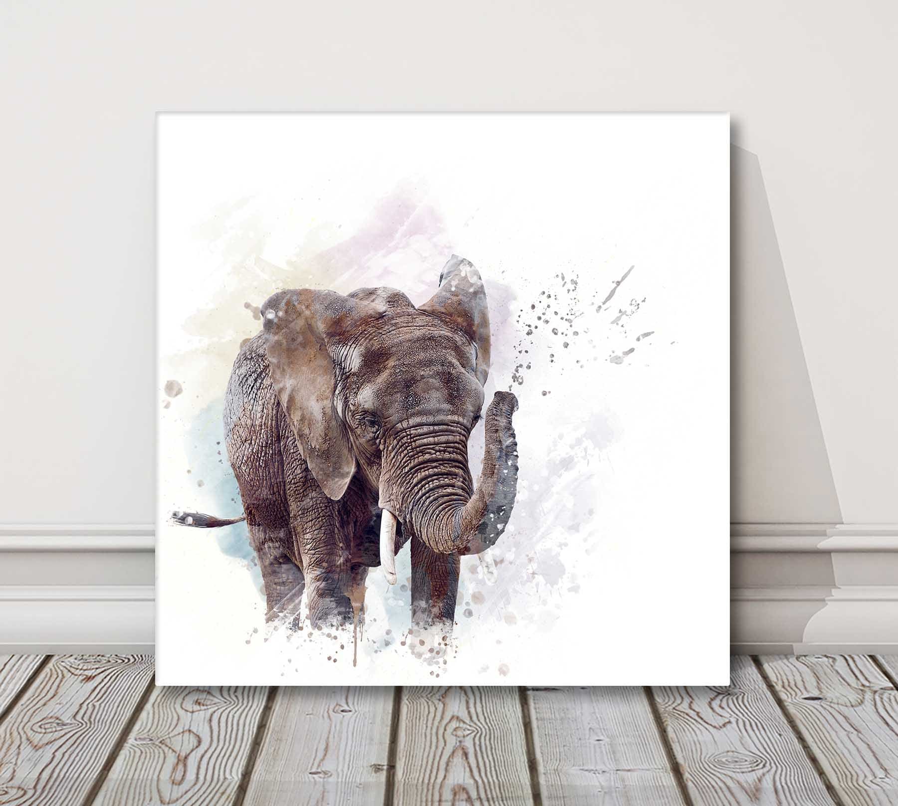 Elephant image in watercolour with colour splash and white background. Canvas picture print. Wildlife image. Choice of sizes available to order.