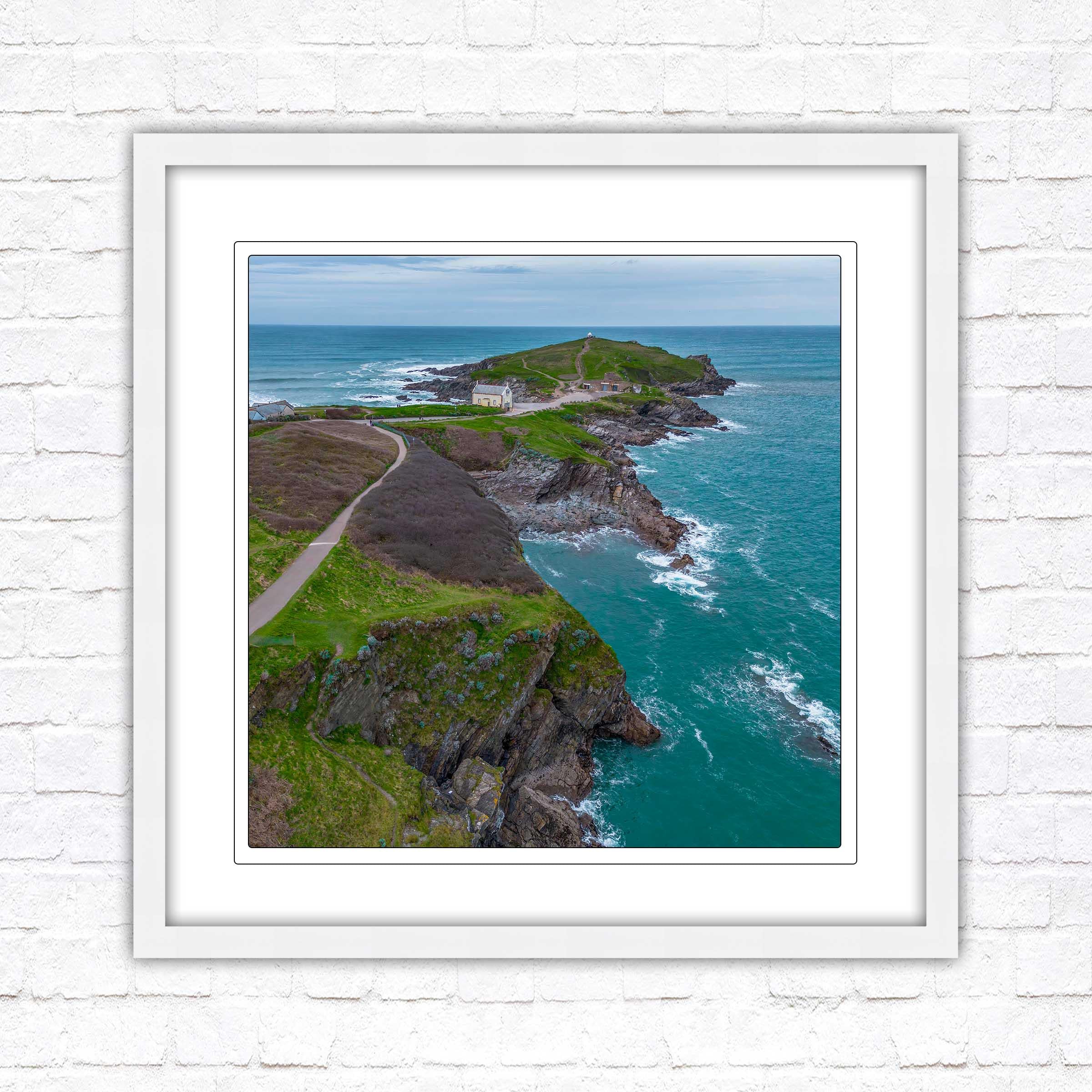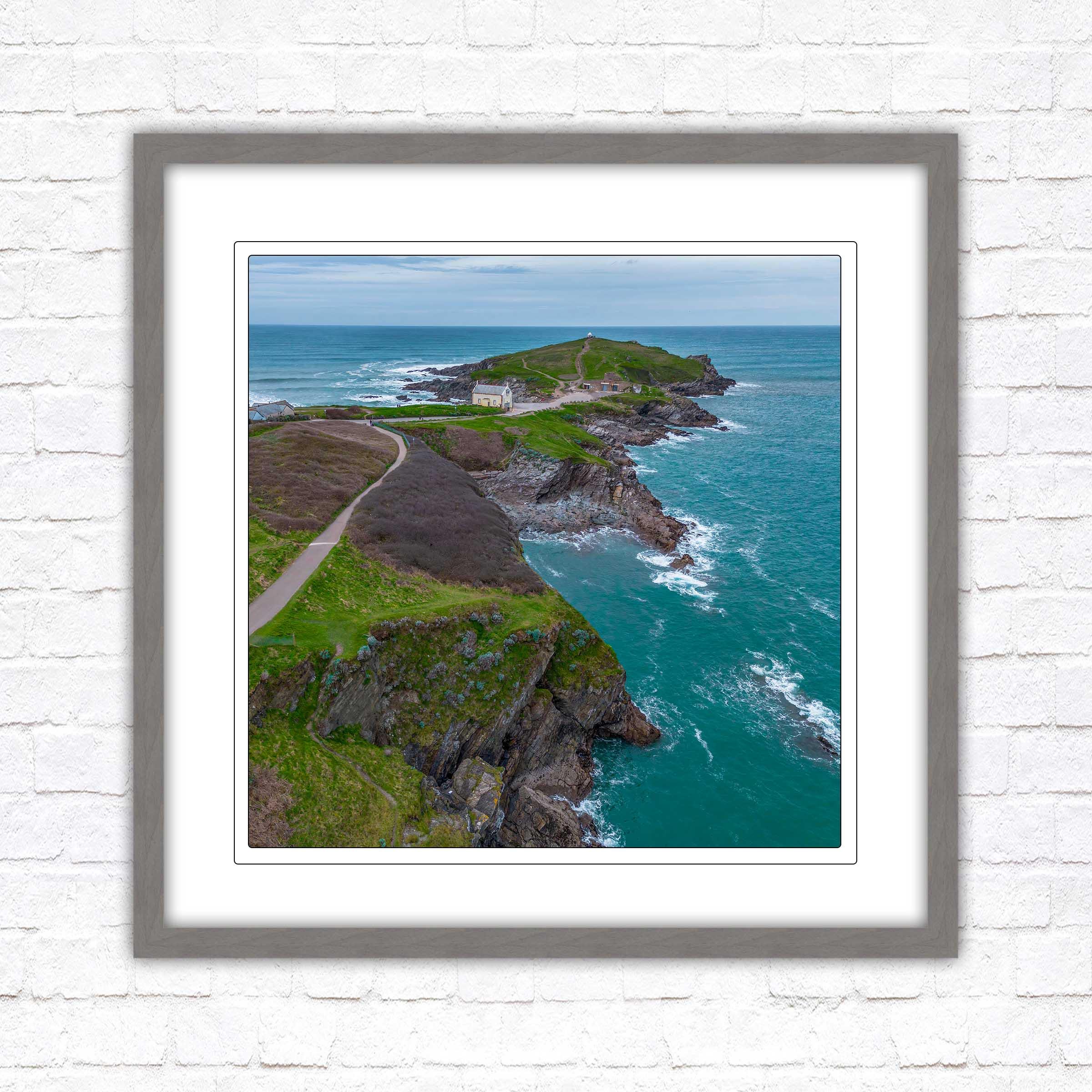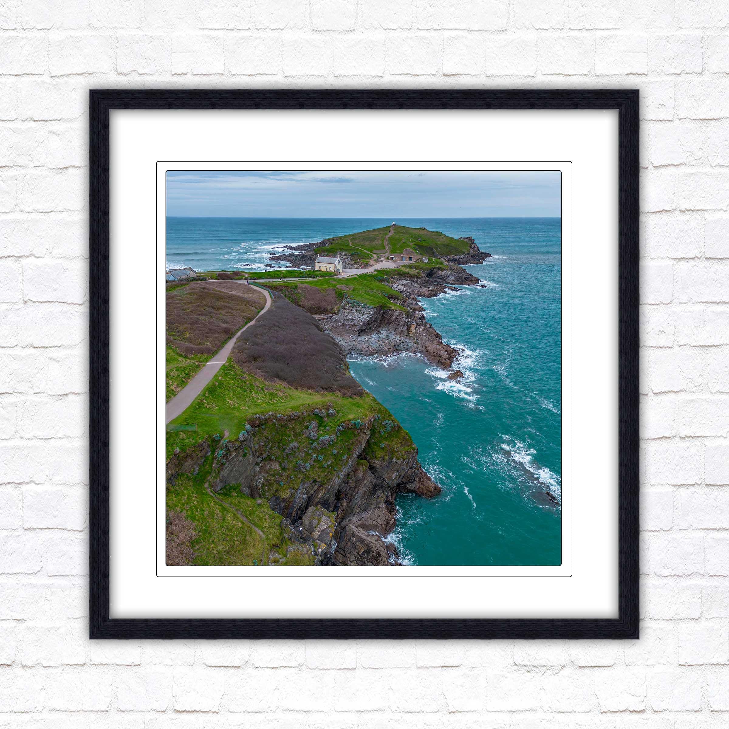 Newquay headland, aerial picture. Framed picture. Choose from a choice of frame styles and sizes.