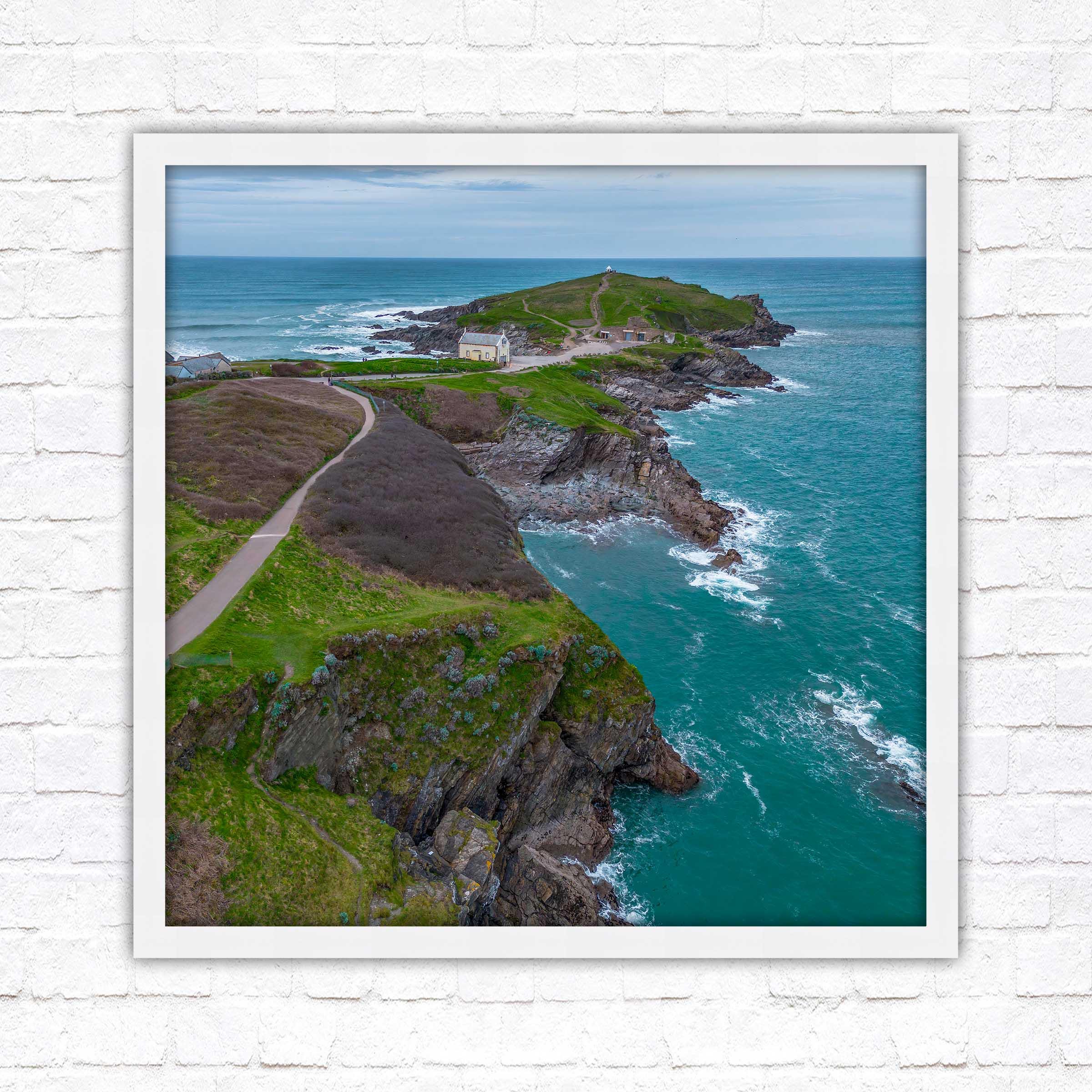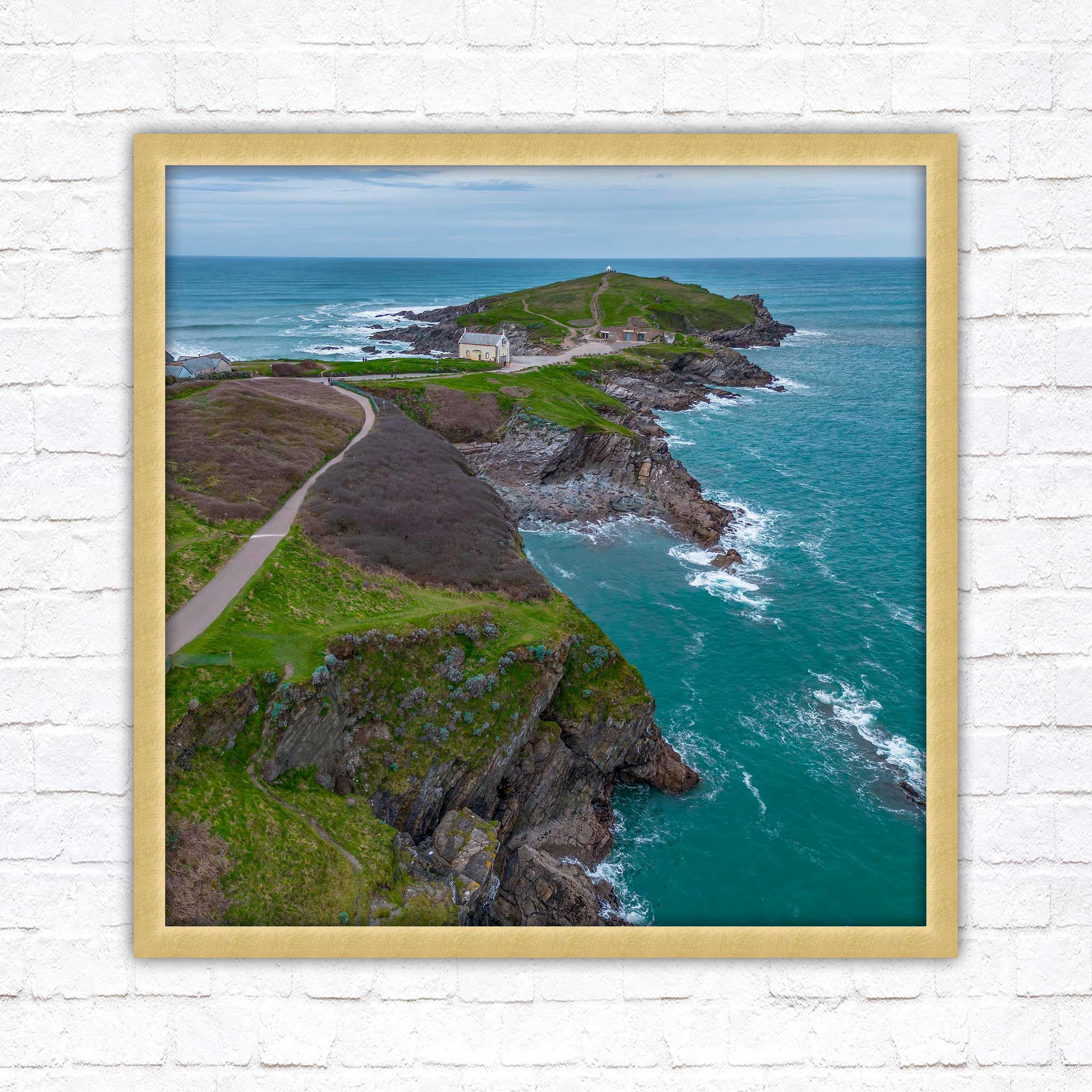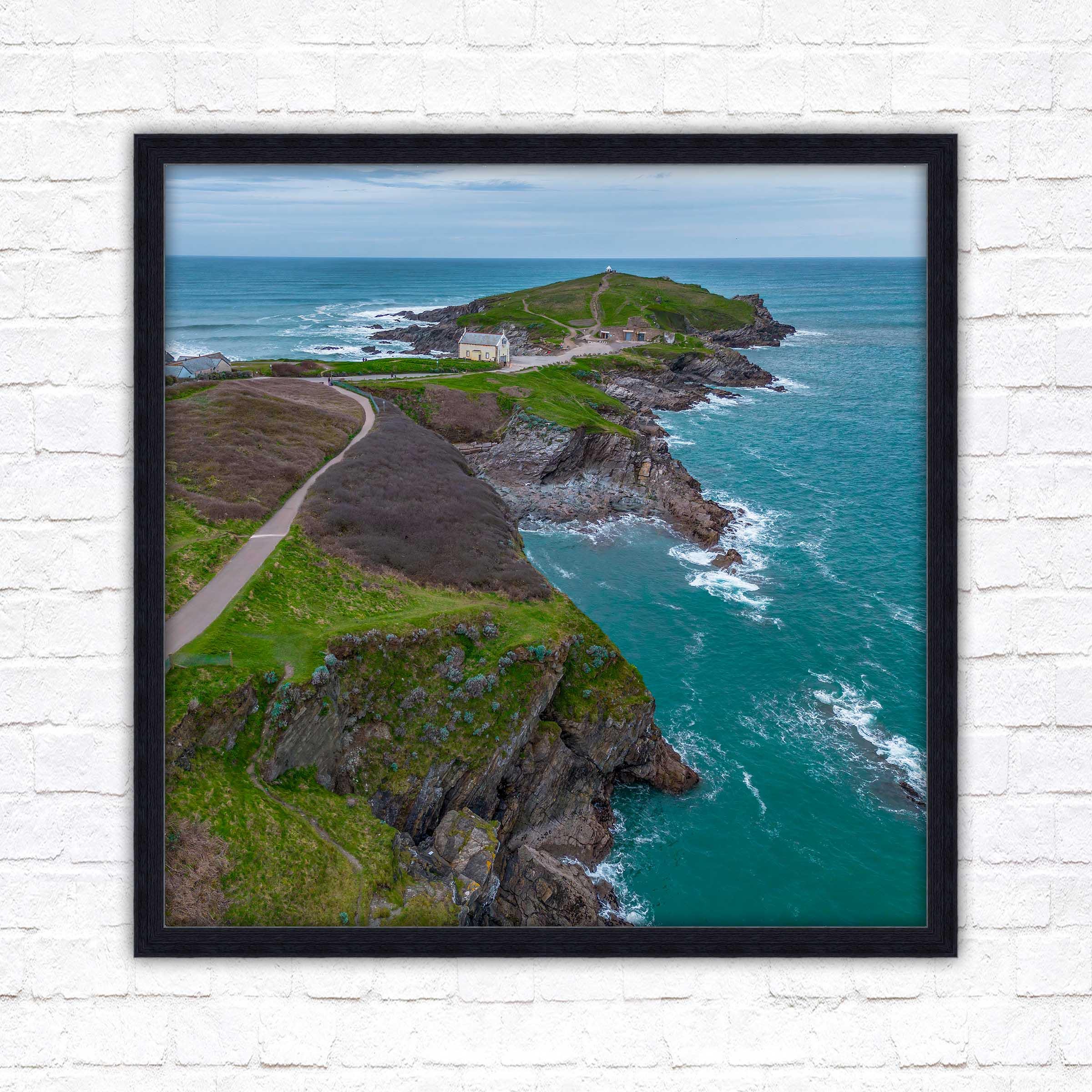 Newquay headland, aerial picture. Framed picture. Choose from a choice of frame styles and sizes.