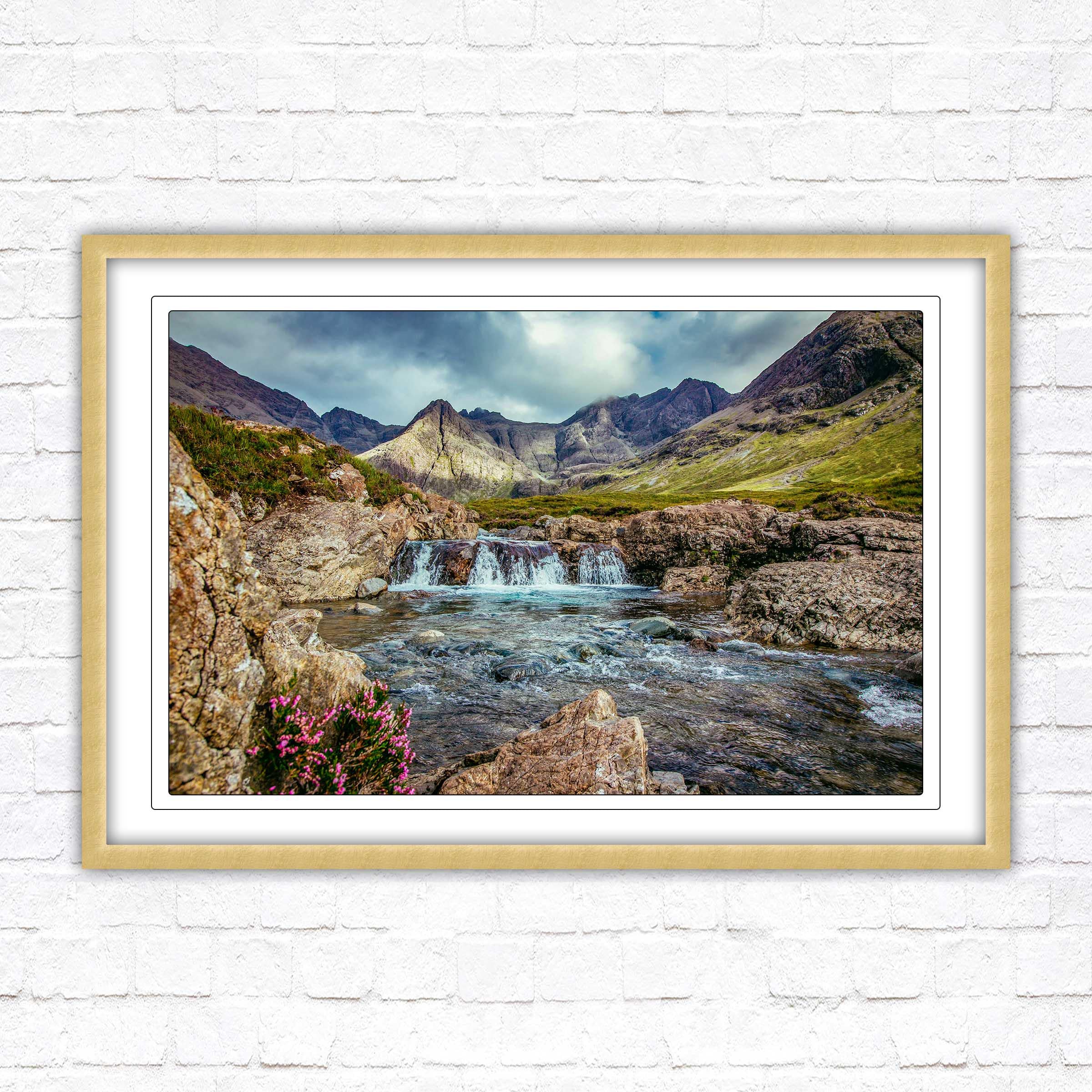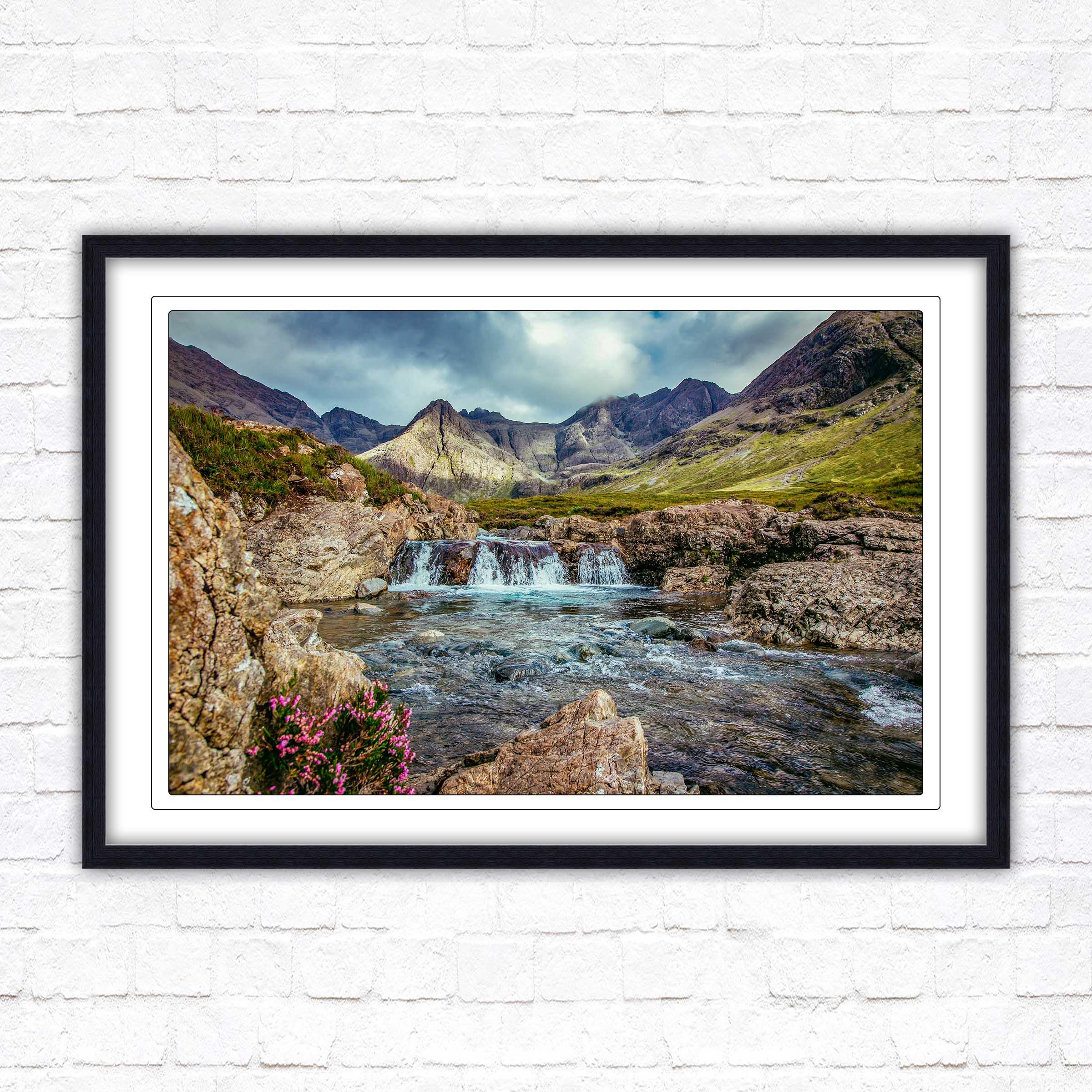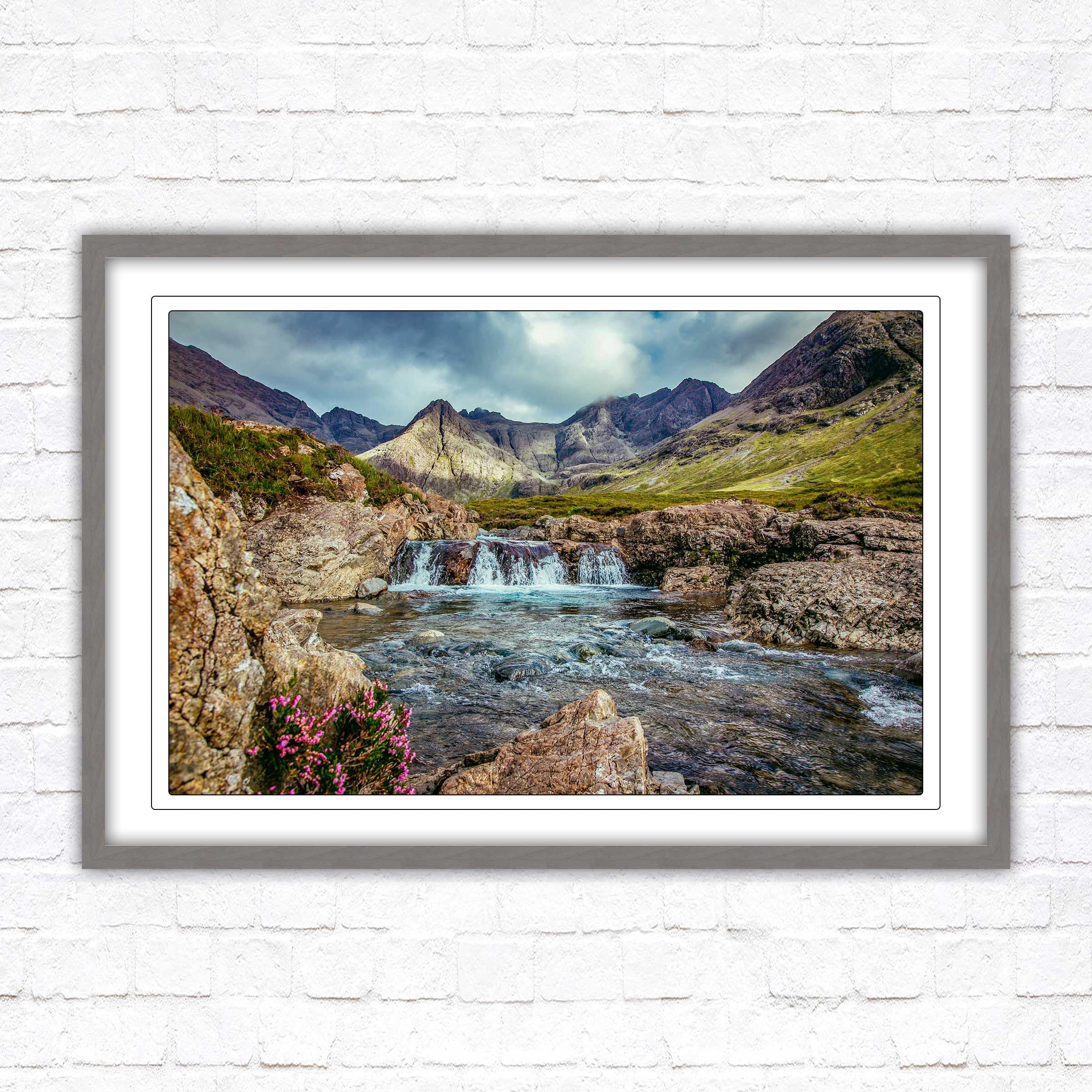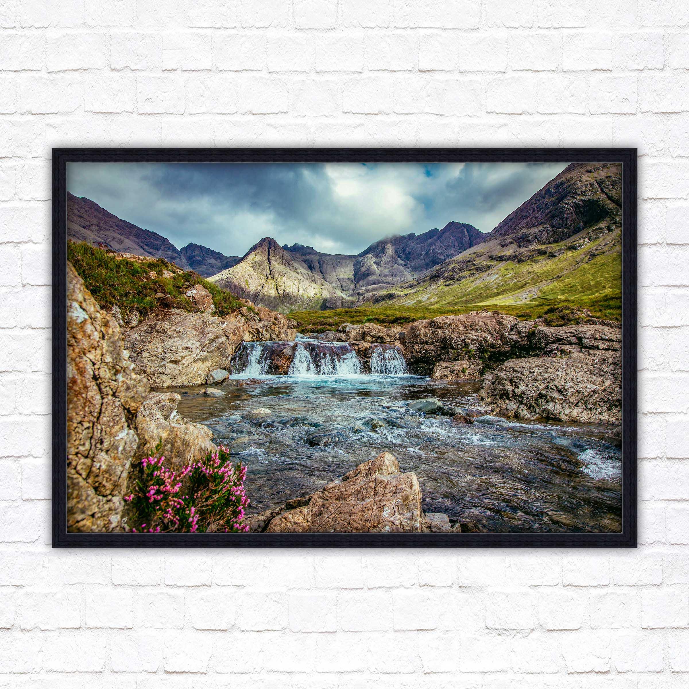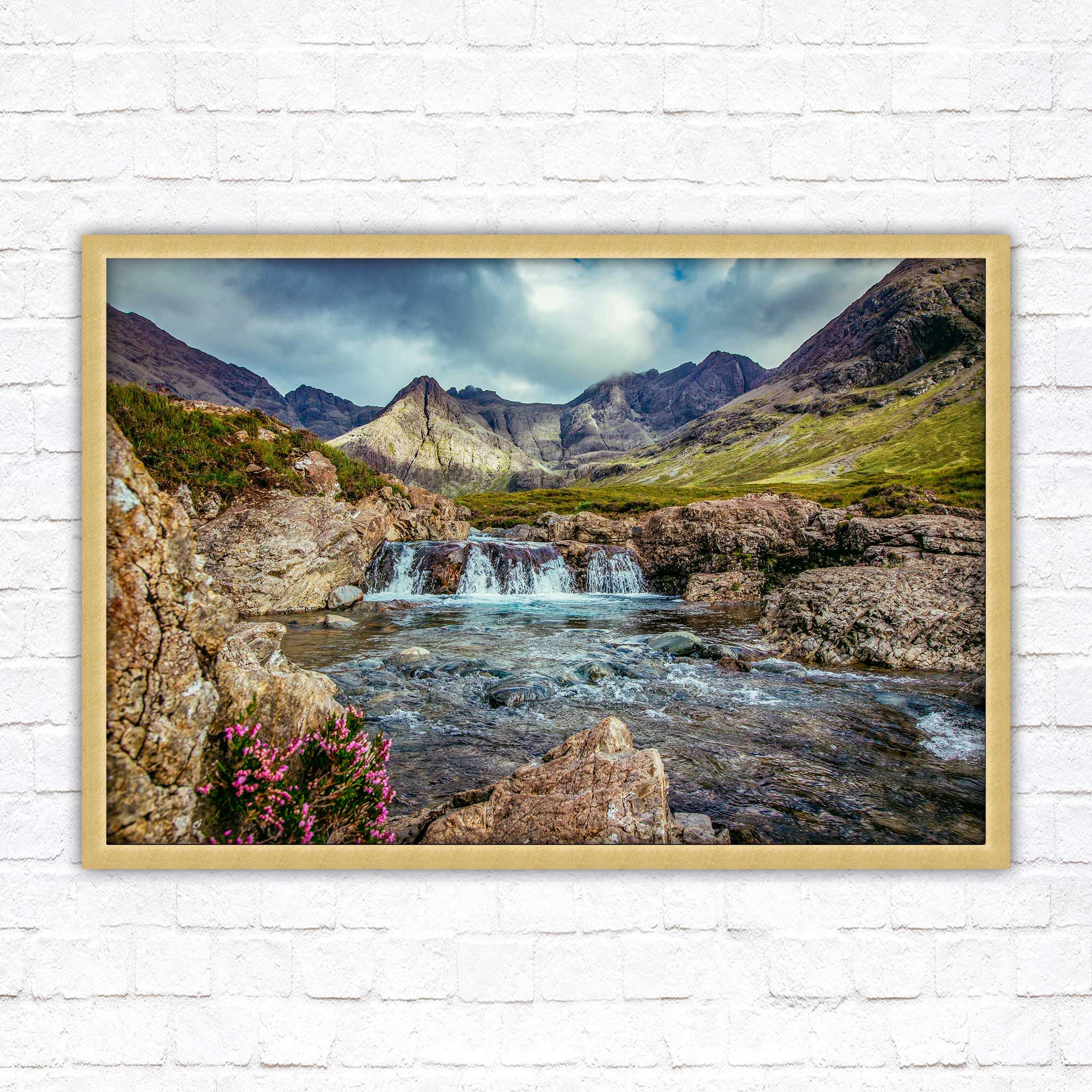 Bring a touch of enchanting beauty to your home with a stunning, framed picture of the Fairy Pools on the Isle of Skye, Scotland. This breath-taking landscape captures the crystal-clear waters and the lush greenery of one of Scotland's most iconic natural wonders.