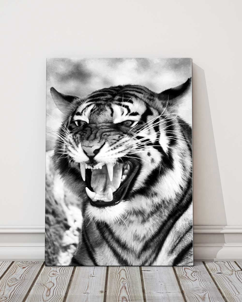 Fierce Growling Tiger. Black and white wildlife image. Printed and framed as a canvas picture print. Choice of sizes available to order.