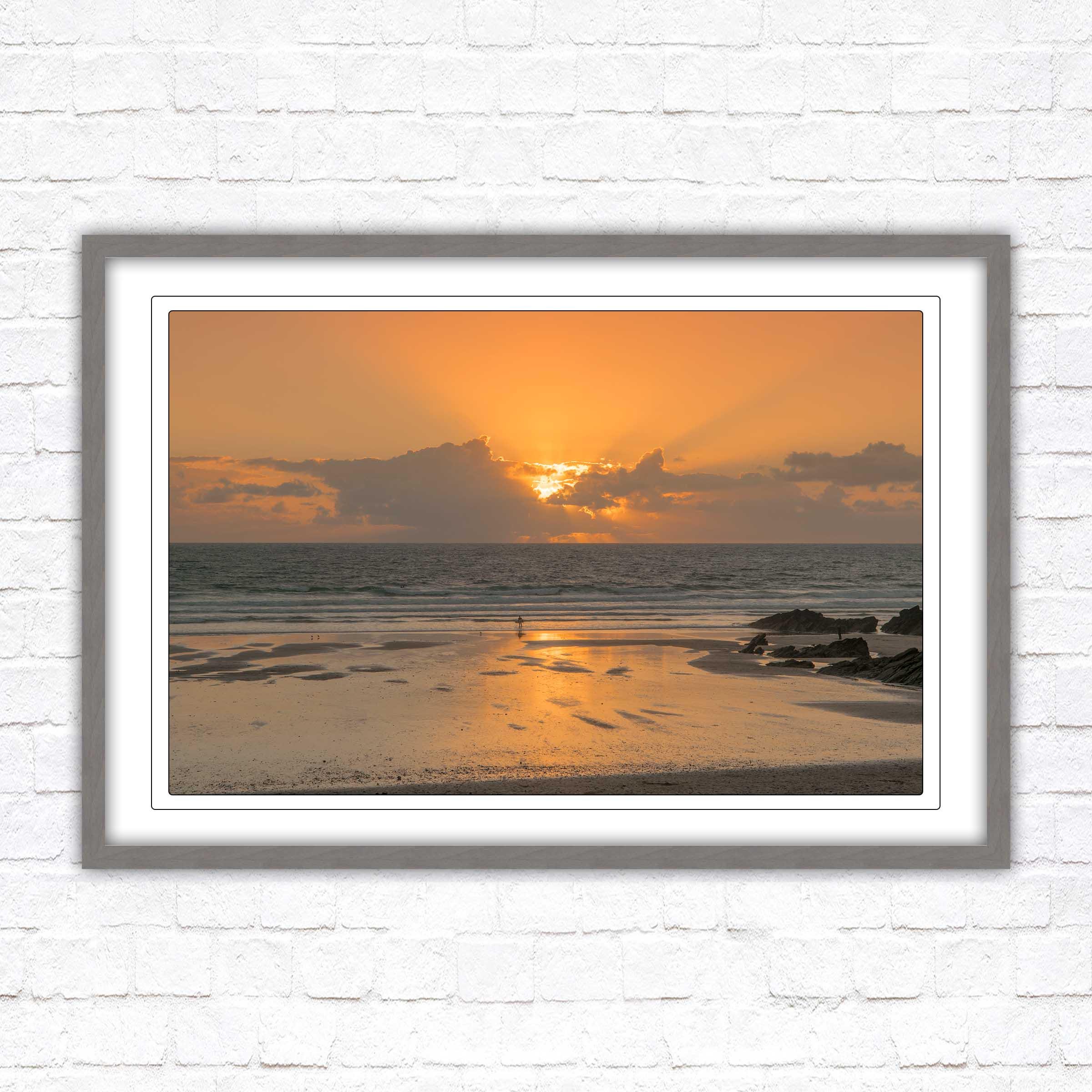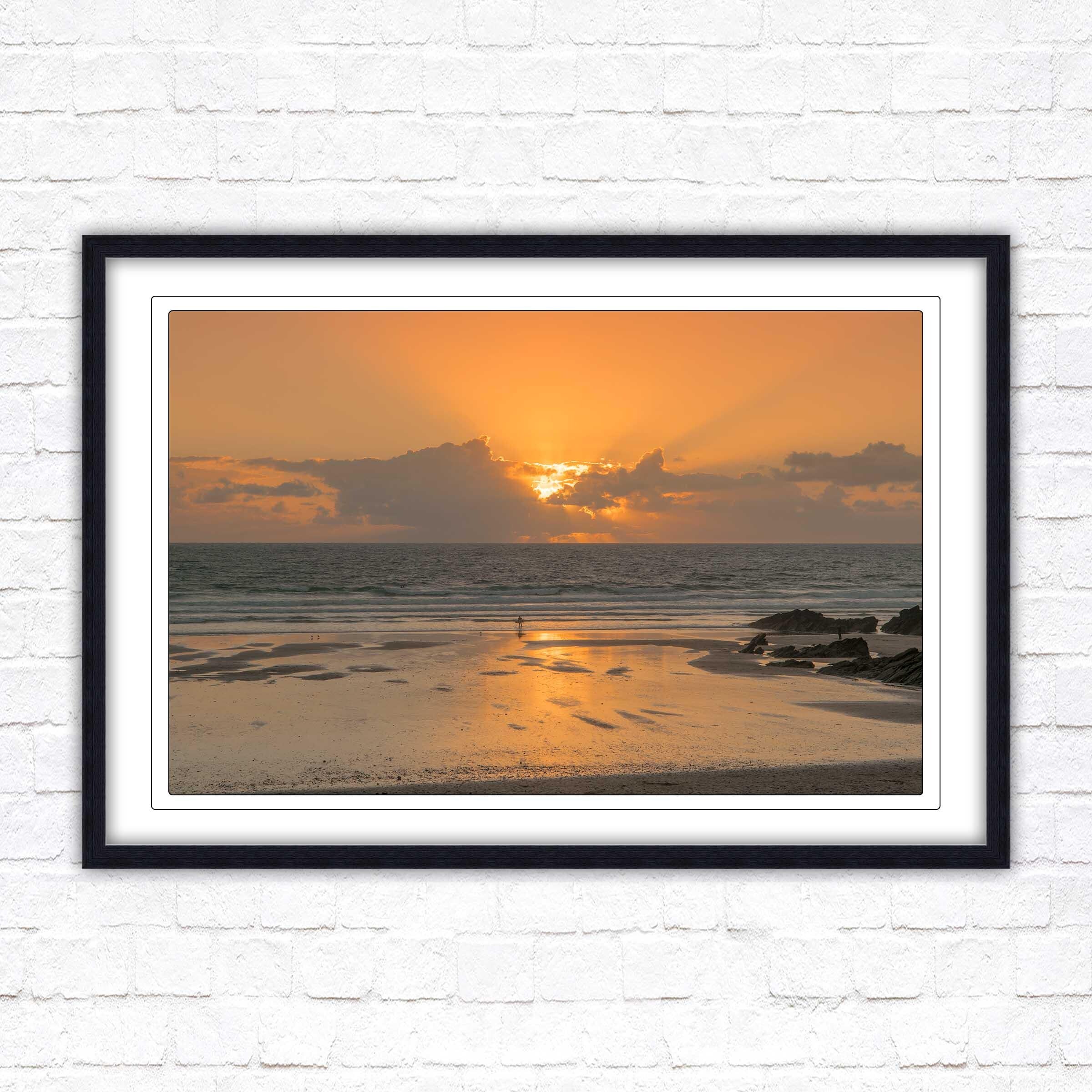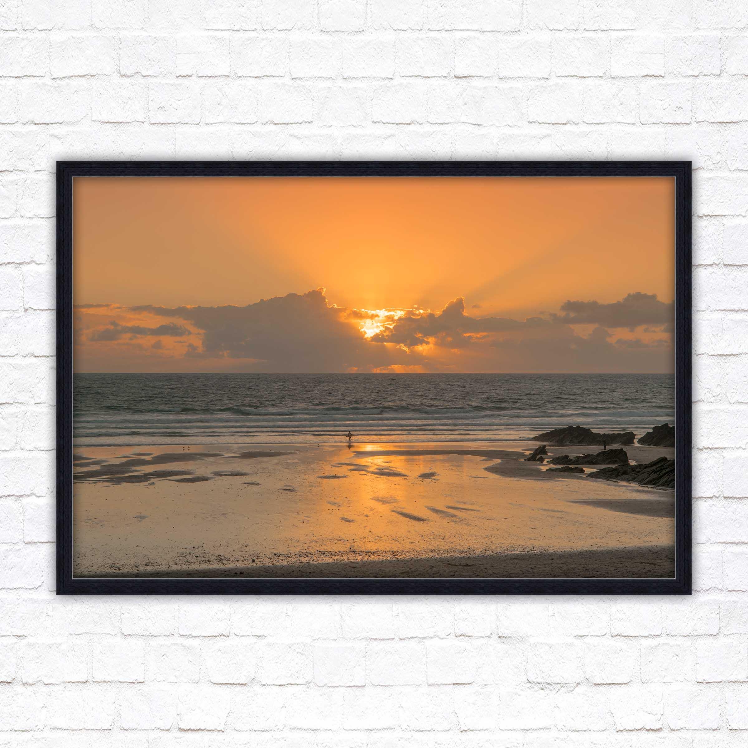 Fistral beach at sunset. North Cornwall coast. Popular surfing beach. Waves. Sunset framed picture. Choose from a selection of frame styles.