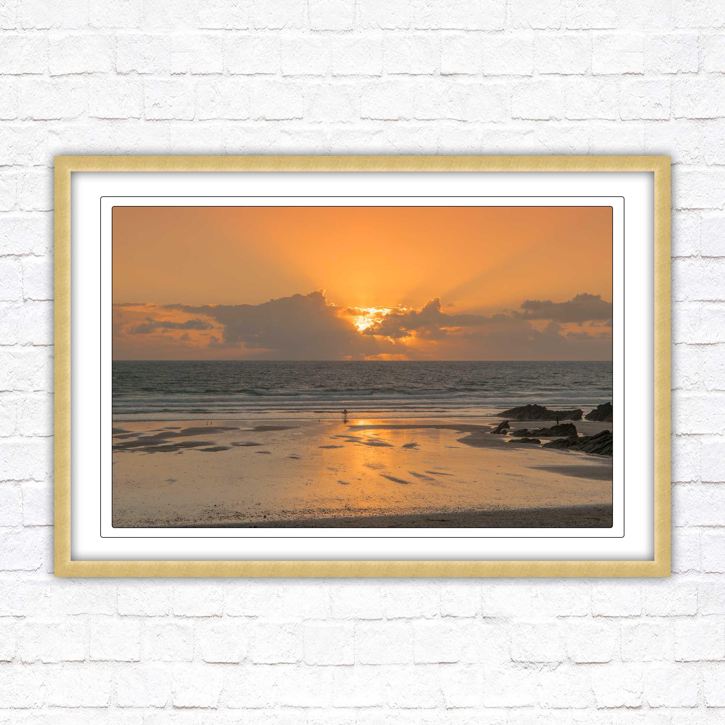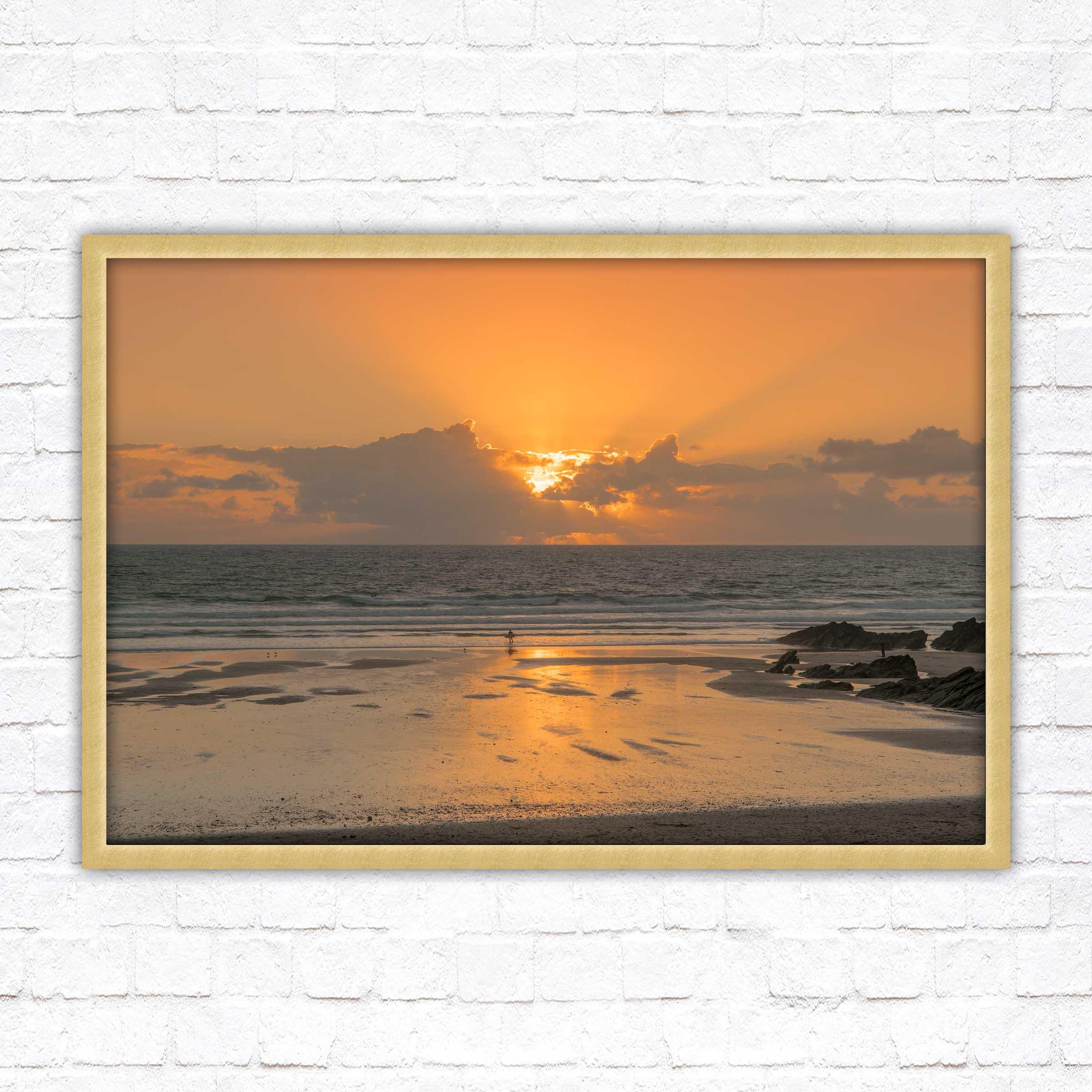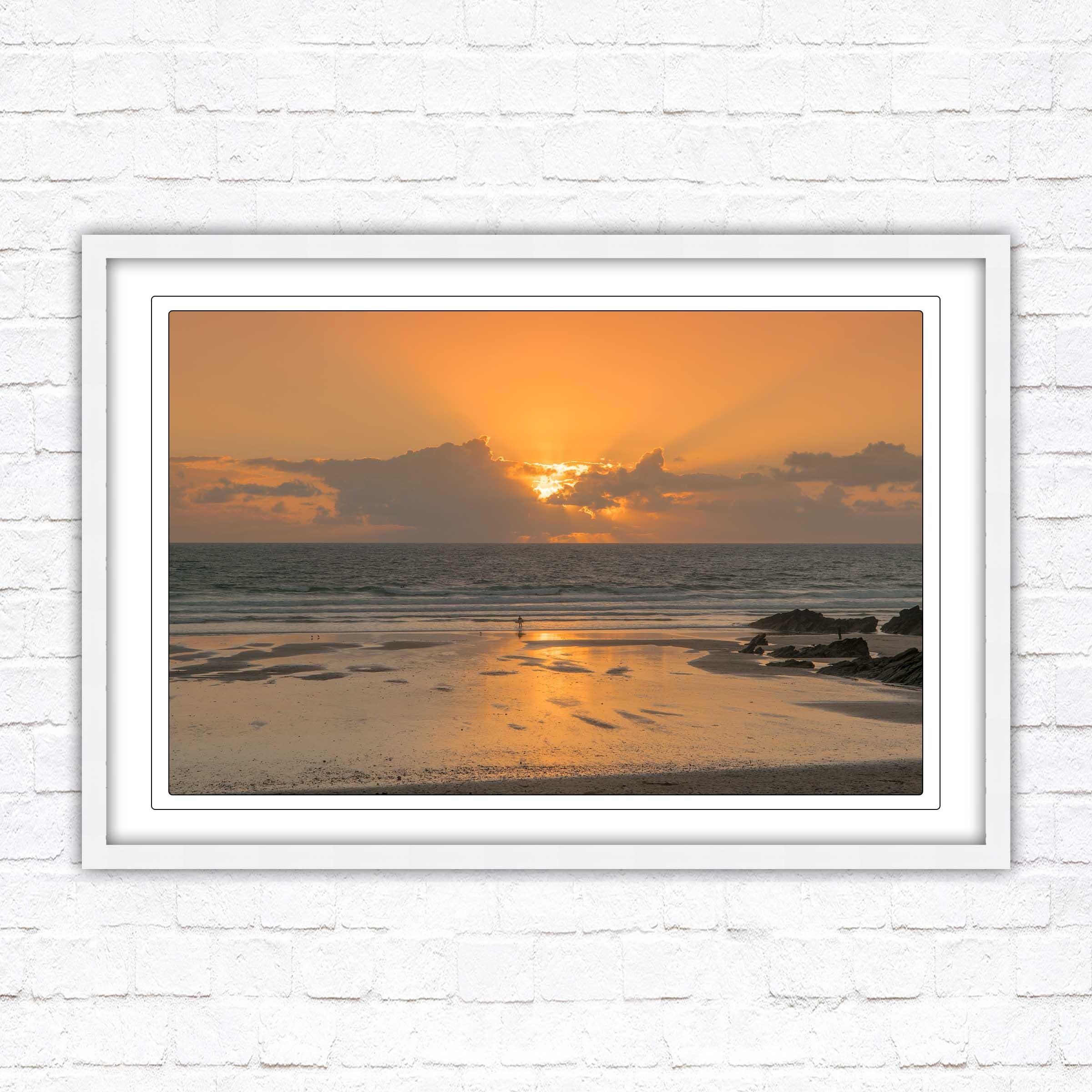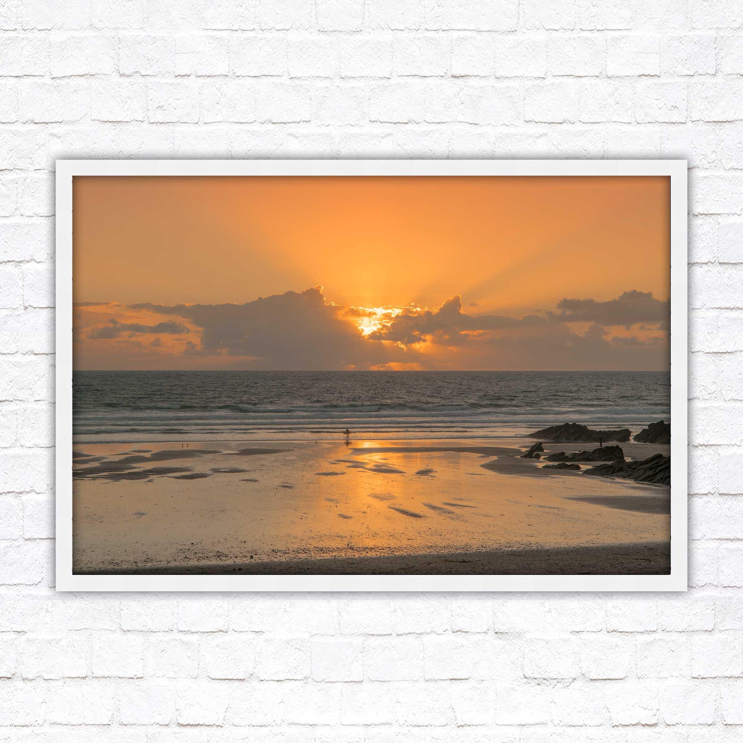 Fistral beach at sunset. North Cornwall coast. Popular surfing beach. Waves. Sunset framed picture. Choose from a selection of frame styles.