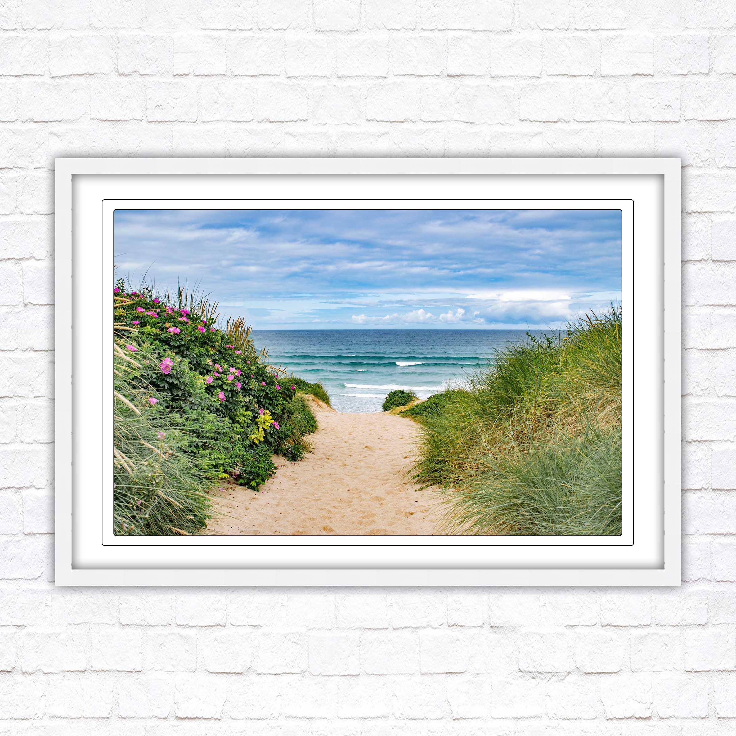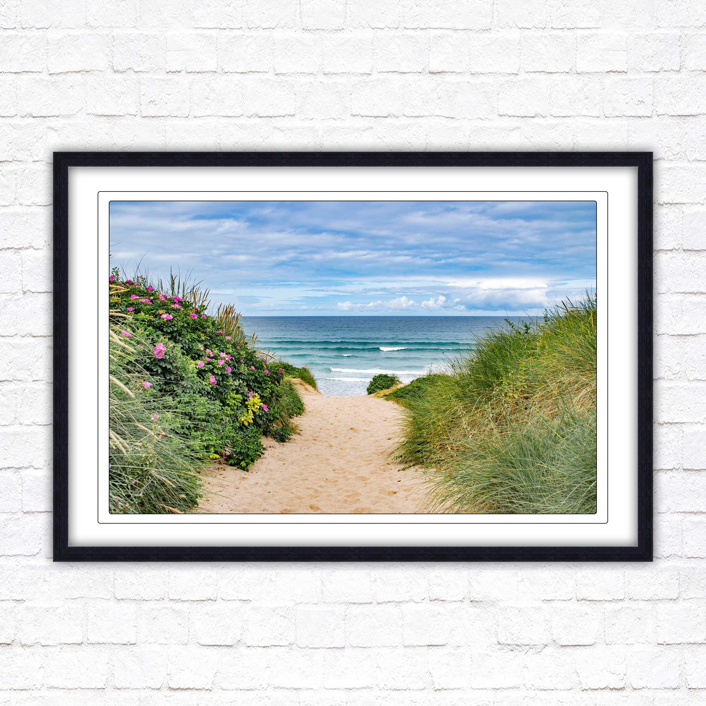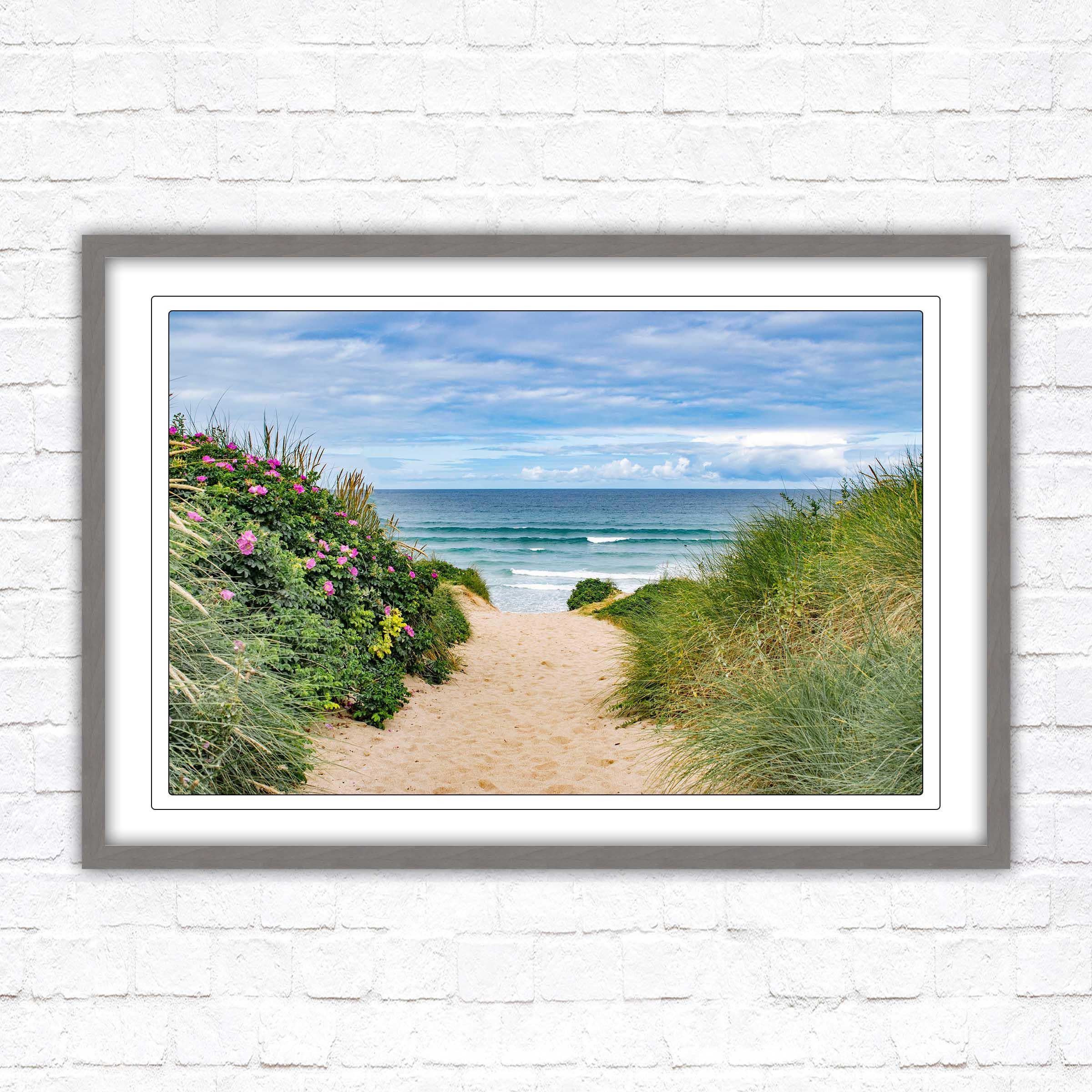 Fistral beach path, North Cornwall coast. Popular surfing beach. Waves. Framed picture. Choose from a selection of frame styles.