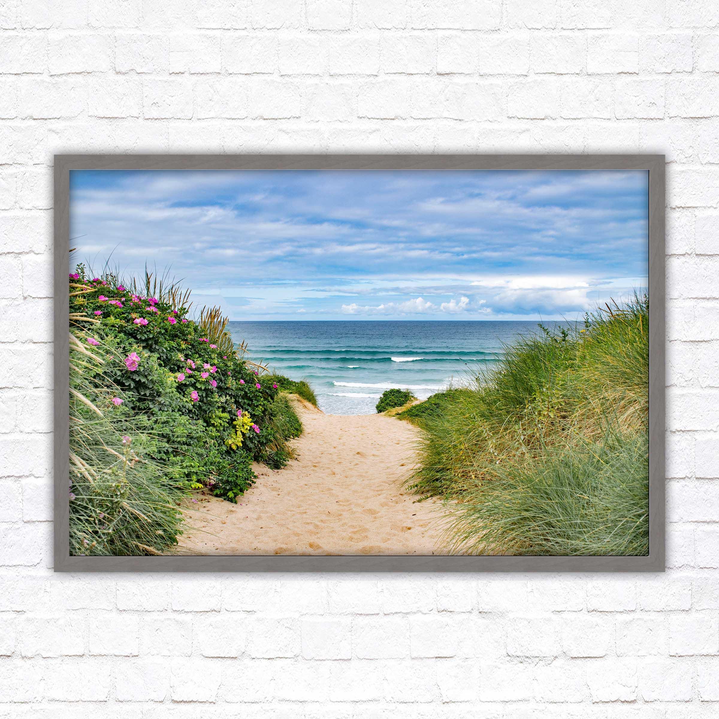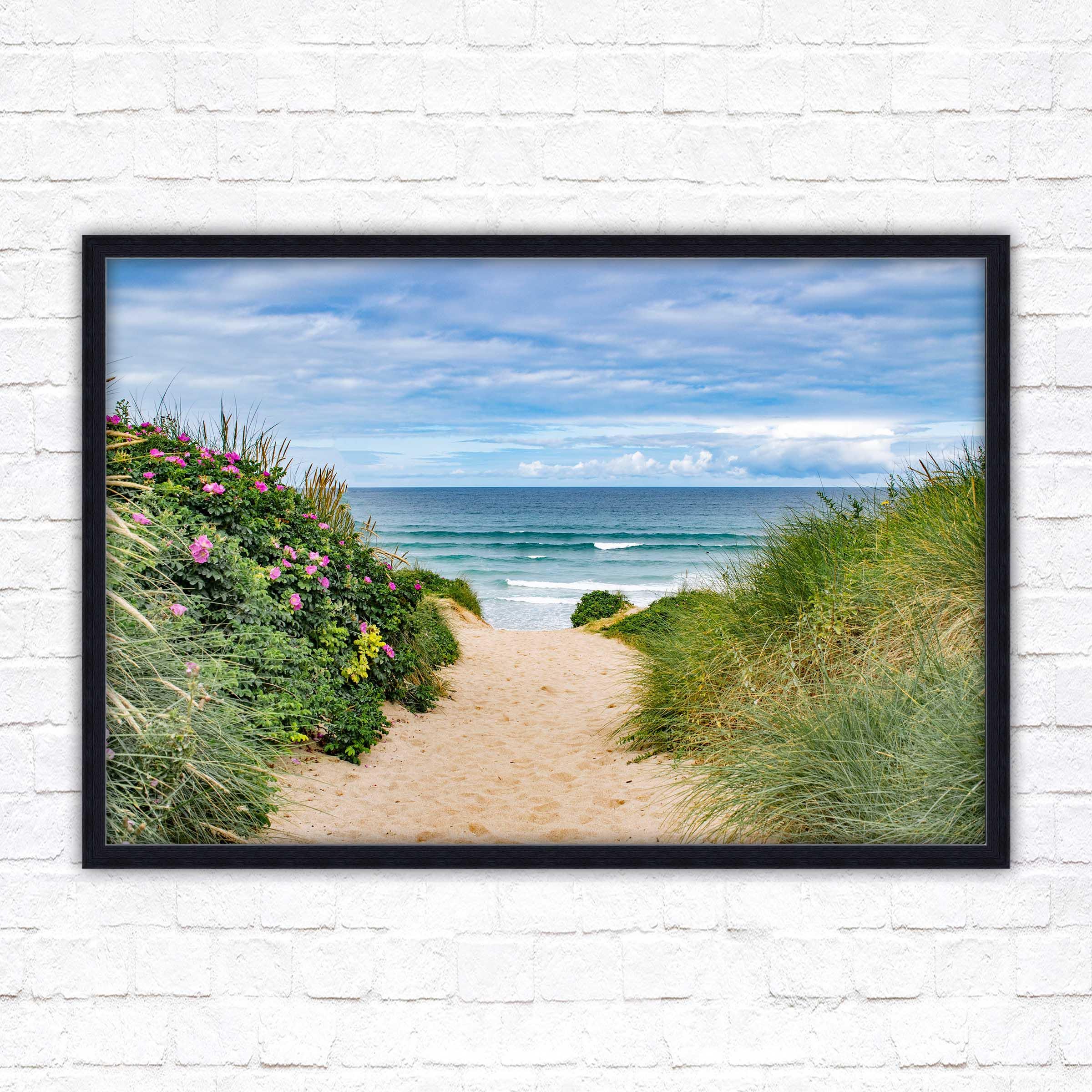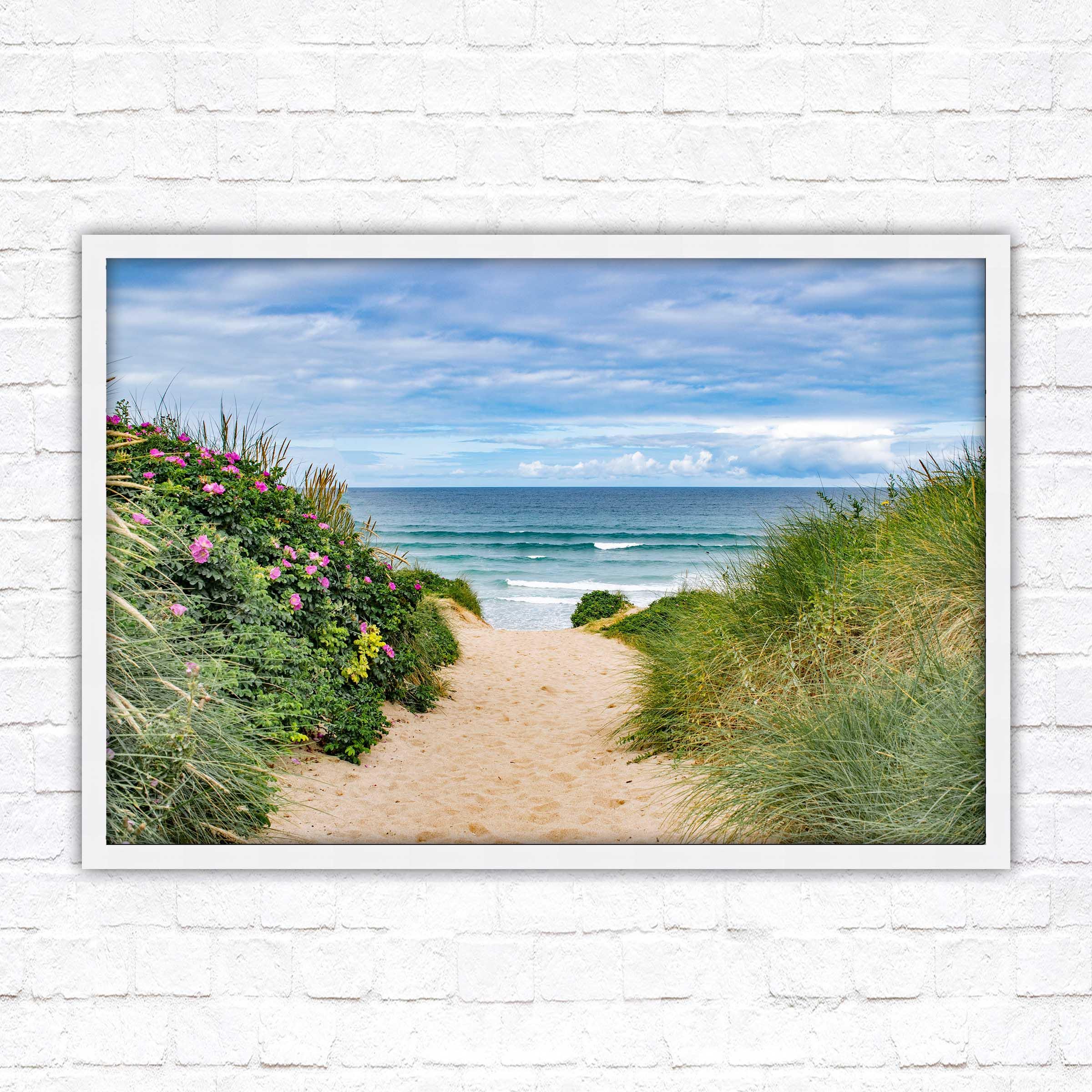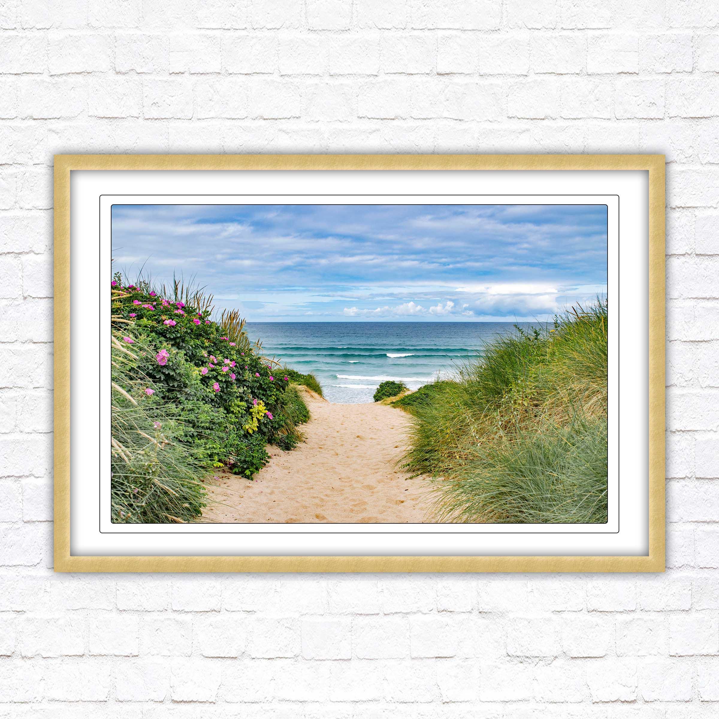 Fistral beach path, North Cornwall coast. Popular surfing beach. Waves. Framed picture. Choose from a selection of frame styles.
