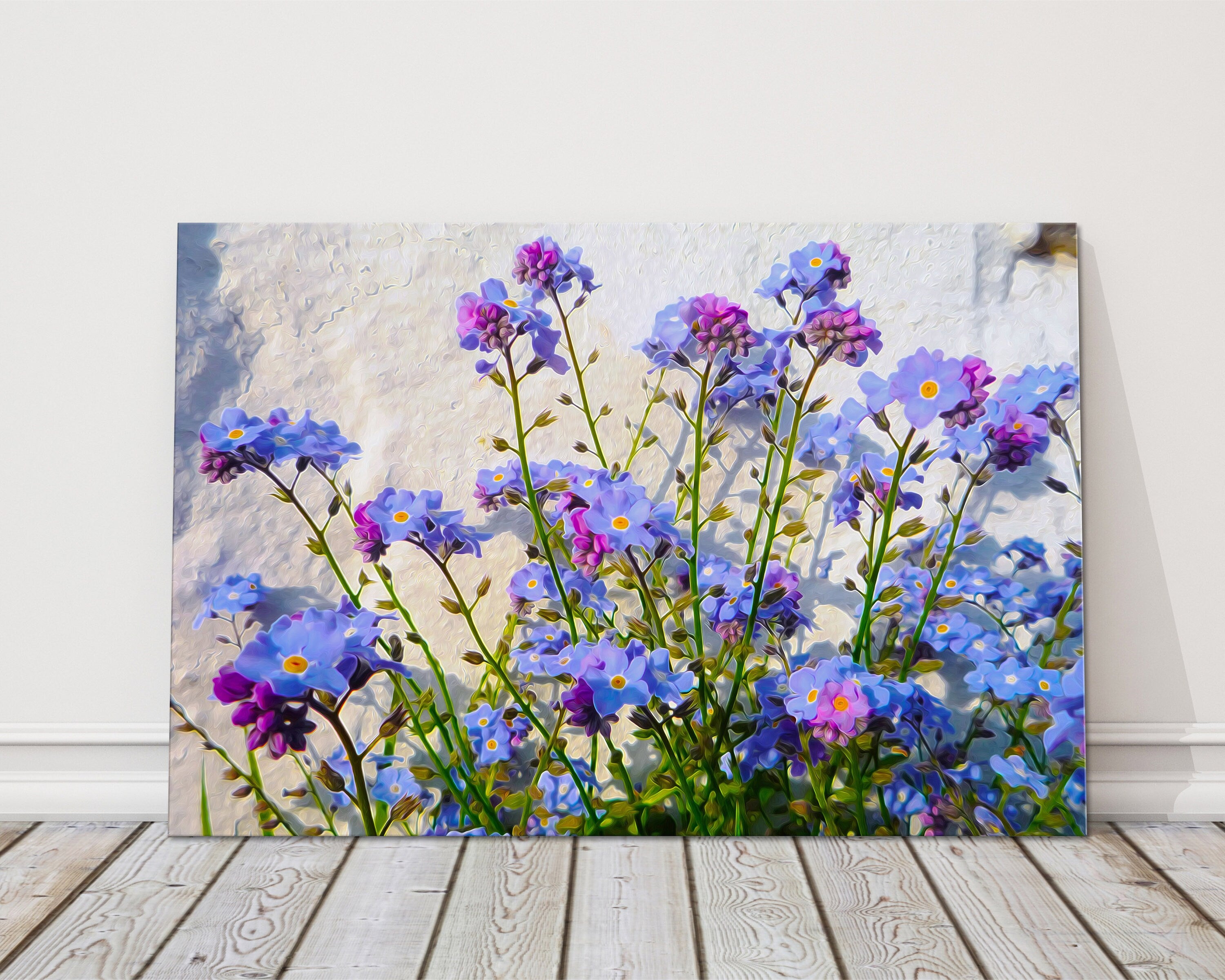 Wild Forget me Nots pictured in front a white stone wall background. Canvas picture printed and framed as a canvas... Read more